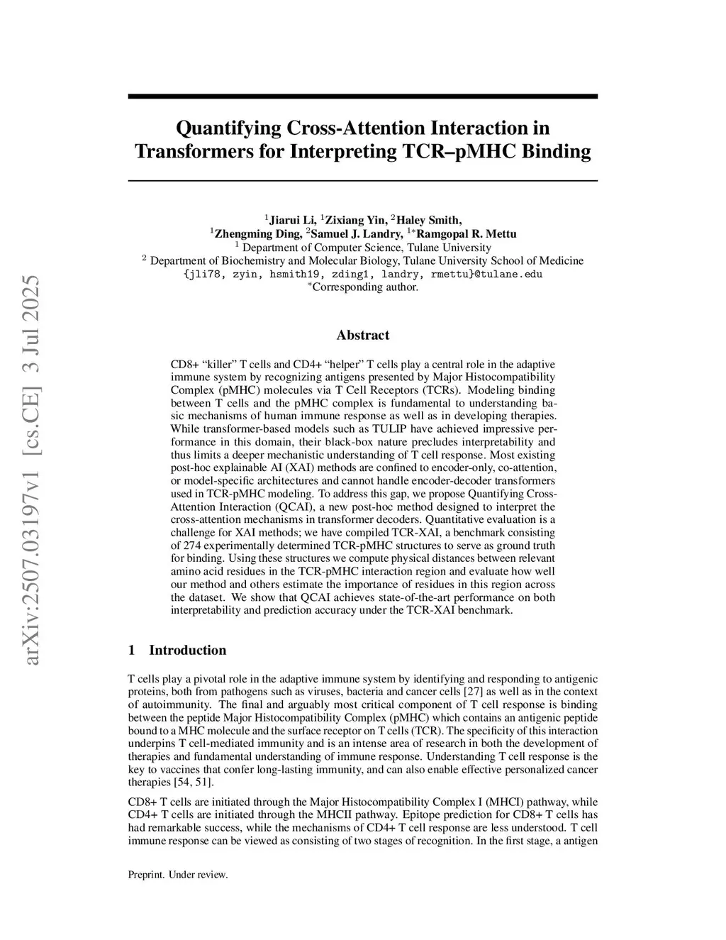 CD8+ "killer" T cells and CD4+ "helper" T cells play a central role in the adaptive immune system by recognizing antigens presented by Major Histocompatibility Complex (pMHC) molecules via T Cell Receptors (TCRs). Modeling binding between T cells and the pMHC complex is fundamental to understanding basic mechanisms of human immune response as well as in developing therapies. While transformer-based models such as TULIP have achieved impressive performance in this domain, their black-box nature precludes interpretability and thus limits a deeper mechanistic understanding of T cell response. Most existing post-hoc explainable AI (XAI) methods are confined to encoder-only, co-attention, or model-specific architectures and cannot handle encoder-decoder transformers used in TCR-pMHC modeling. To address this gap, we propose Quantifying Cross-Attention Interaction (QCAI), a new post-hoc method designed to interpret the cross-attention mechanisms in transformer decoders. Quantitative evaluation is a challenge for XAI methods; we have compiled TCR-XAI, a benchmark consisting of 274 experimentally determined TCR-pMHC structures to serve as ground truth for binding. Using these structures we compute physical distances between relevant amino acid residues in the TCR-pMHC interaction region and evaluate how well our method and others estimate the importance of residues in this region across the dataset. We show that QCAI achieves state-of-the-art performance on both interpretability and prediction accuracy under the TCR-XAI benchmark.
