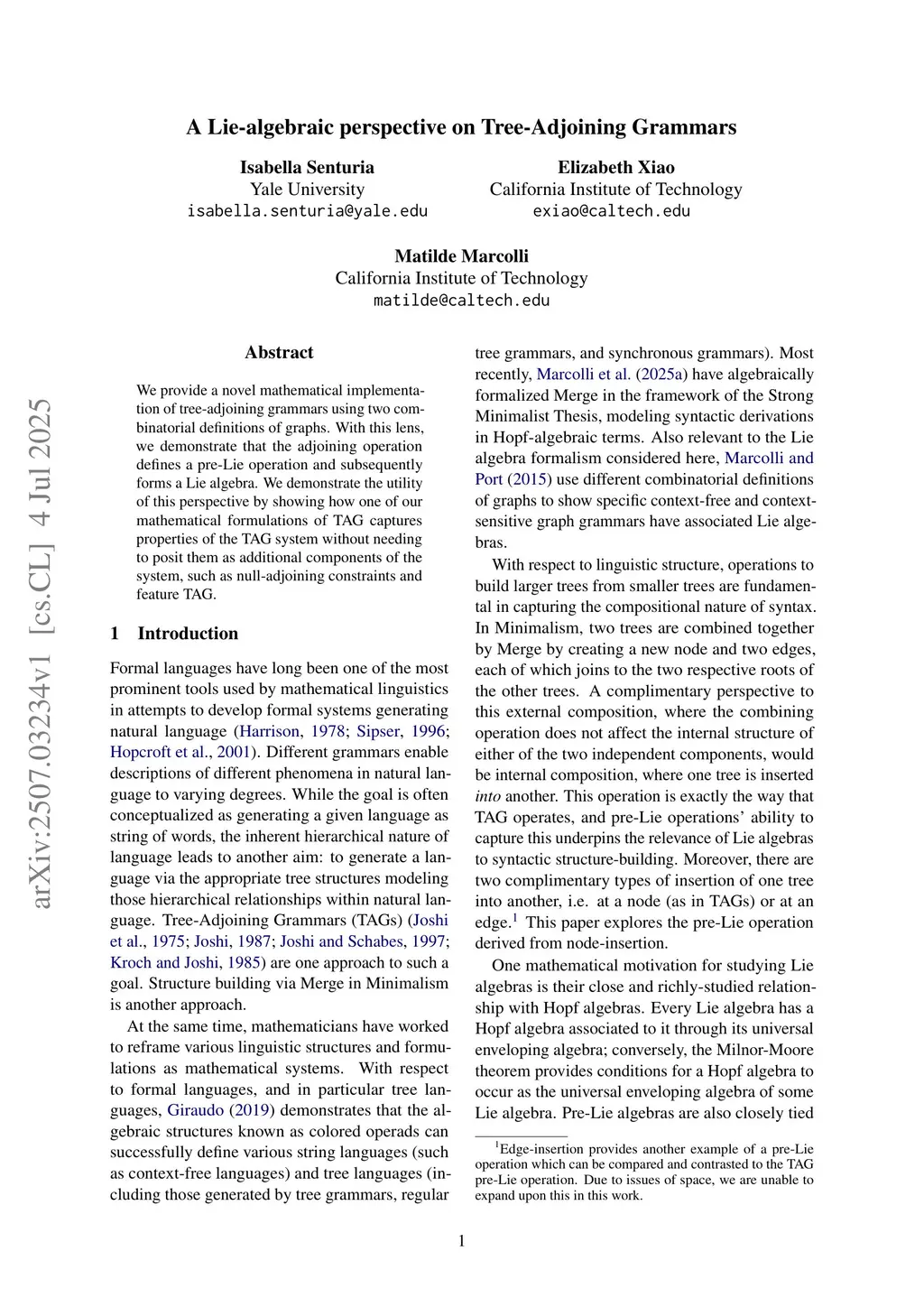 We provide a novel mathematical implementation of tree-adjoining grammars using two combinatorial definitions of graphs. With this lens, we demonstrate that the adjoining operation defines a pre-Lie operation and subsequently forms a Lie algebra. We demonstrate the utility of this perspective by showing how one of our mathematical formulations of TAG captures properties of the TAG system without needing to posit them as additional components of the system, such as null-adjoining constraints and feature TAG.