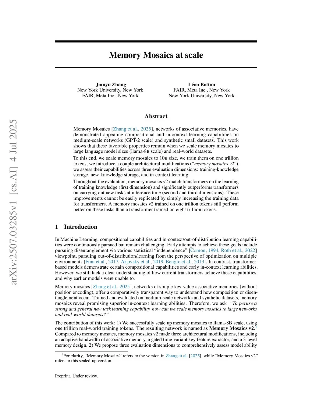 Memory Mosaics [Zhang et al., 2025], networks of associative memories, have demonstrated appealing compositional and in-context learning capabilities on medium-scale networks (GPT-2 scale) and synthetic small datasets. This work shows that these favorable properties remain when we scale memory mosaics to large language model sizes (llama-8B scale) and real-world datasets.To this end, we scale memory mosaics to 10B size, we train them on one trillion tokens, we introduce a couple architectural modifications ("Memory Mosaics v2"), we assess their capabilities across three evaluation dimensions: training-knowledge storage, new-knowledge storage, and in-context learning.Throughout the evaluation, memory mosaics v2 match transformers on the learning of training knowledge (first dimension) and significantly outperforms transformers on carrying out new tasks at inference time (second and third dimensions). These improvements cannot be easily replicated by simply increasing the training data for transformers. A memory mosaics v2 trained on one trillion tokens still perform better on these tasks than a transformer trained on eight trillion tokens.