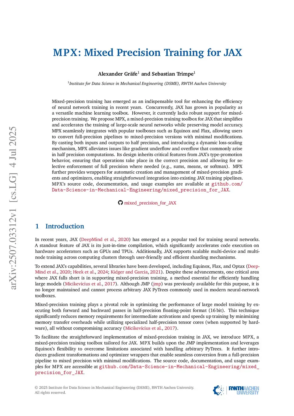 Mixed-precision training has emerged as an indispensable tool for enhancing the efficiency of neural network training in recent years. Concurrently, JAX has grown in popularity as a versatile machine learning toolbox. However, it currently lacks robust support for mixed-precision training. We propose MPX, a mixed-precision training toolbox for JAX that simplifies and accelerates the training of large-scale neural networks while preserving model accuracy. MPX seamlessly integrates with popular toolboxes such as Equinox and Flax, allowing users to convert full-precision pipelines to mixed-precision versions with minimal modifications. By casting both inputs and outputs to half precision, and introducing a dynamic loss-scaling mechanism, MPX alleviates issues like gradient underflow and overflow that commonly arise in half precision computations. Its design inherits critical features from JAX's type-promotion behavior, ensuring that operations take place in the correct precision and allowing for selective enforcement of full precision where needed (e.g., sums, means, or softmax). MPX further provides wrappers for automatic creation and management of mixed-precision gradients and optimizers, enabling straightforward integration into existing JAX training pipelines. MPX's source code, documentation, and usage examples are available atthis http URL.
