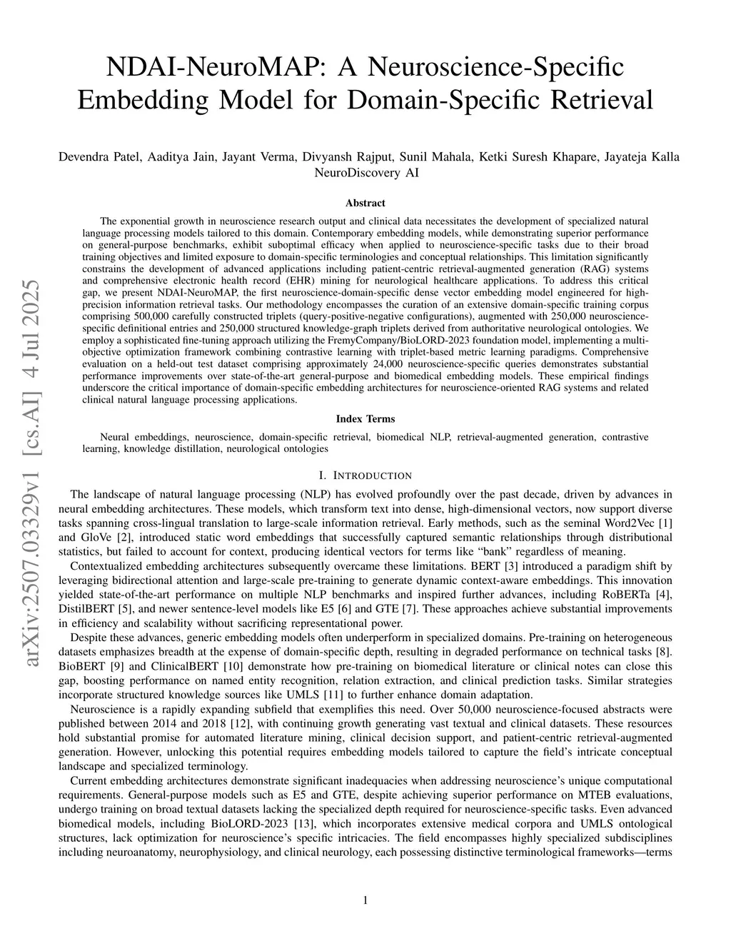 We present NDAI-NeuroMAP, the first neuroscience-domain-specific dense vector embedding model engineered for high-precision information retrieval tasks. Our methodology encompasses the curation of an extensive domain-specific training corpus comprising 500,000 carefully constructed triplets (query-positive-negative configurations), augmented with 250,000 neuroscience-specific definitional entries and 250,000 structured knowledge-graph triplets derived from authoritative neurological ontologies. We employ a sophisticated fine-tuning approach utilizing the FremyCompany/BioLORD-2023 foundation model, implementing a multi-objective optimization framework combining contrastive learning with triplet-based metric learning paradigms. Comprehensive evaluation on a held-out test dataset comprising approximately 24,000 neuroscience-specific queries demonstrates substantial performance improvements over state-of-the-art general-purpose and biomedical embedding models. These empirical findings underscore the critical importance of domain-specific embedding architectures for neuroscience-oriented RAG systems and related clinical natural language processing applications.