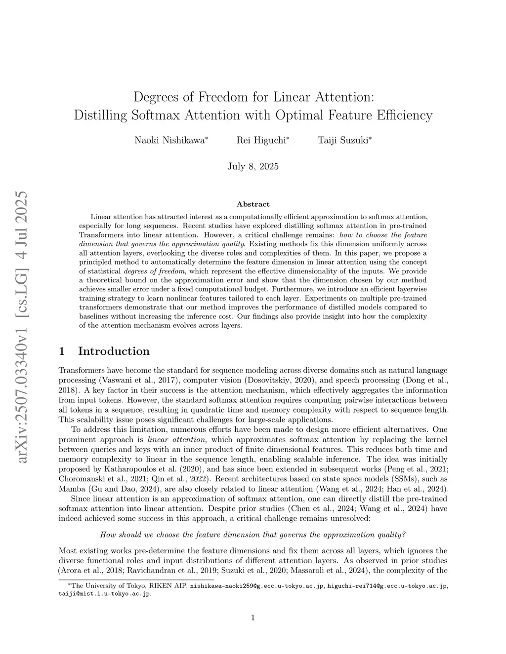 Linear attention has attracted interest as a computationally efficient approximation to softmax attention, especially for long sequences. Recent studies have explored distilling softmax attention in pre-trained Transformers into linear attention. However, a critical challenge remains: how to choose the feature dimension that governs the approximation quality. Existing methods fix this dimension uniformly across all attention layers, overlooking the diverse roles and complexities of them. In this paper, we propose a principled method to automatically determine the feature dimension in linear attention using the concept of statistical degrees of freedom, which represent the effective dimensionality of the inputs. We provide a theoretical bound on the approximation error and show that the dimension chosen by our method achieves smaller error under a fixed computational budget. Furthermore, we introduce an efficient layerwise training strategy to learn nonlinear features tailored to each layer. Experiments on multiple pre-trained transformers demonstrate that our method improves the performance of distilled models compared to baselines without increasing the inference cost. Our findings also provide insight into how the complexity of the attention mechanism evolves across layers.
