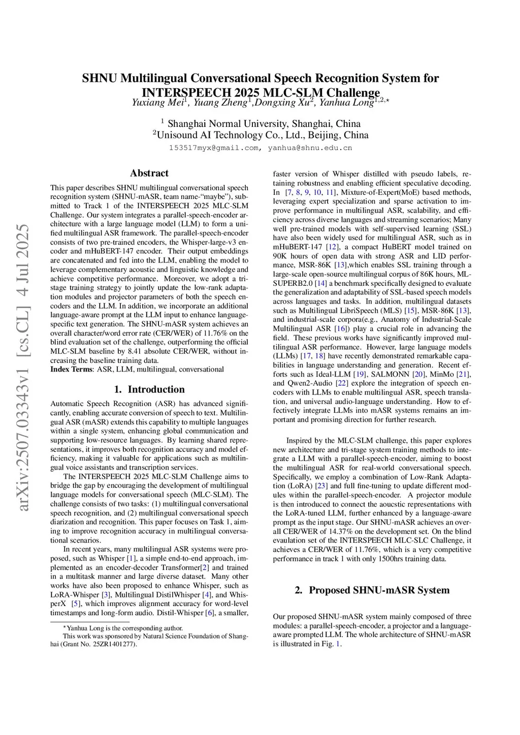 This paper describes SHNU multilingual conversational speech recognition system (SHNU-mASR, team name-"maybe"), submitted to Track 1 of the INTERSPEECH 2025 MLC-SLM Challenge. Our system integrates a parallel-speech-encoder architecture with a large language model (LLM) to form a unified multilingual ASR framework. The parallel-speech-encoder consists of two pre-trained encoders, the Whisper-large-v3 encoder and mHuBERT-147 encoder. Their output embeddings are concatenated and fed into the LLM, enabling the model to leverage complementary acoustic and linguistic knowledge and achieve competitive performance. Moreover, we adopt a tri-stage training strategy to jointly update the low-rank adaptation modules and projector parameters of both the speech encoders and the LLM. In addition, we incorporate an additional language-aware prompt at the LLM input to enhance language-specific text generation. The SHNU-mASR system achieves an overall character/word error rate (CER/WER) of 11.76% on the blind evaluation set of the challenge, outperforming the official MLC-SLM baseline by 8.41 absolute CER/WER, without increasing the baseline training data.