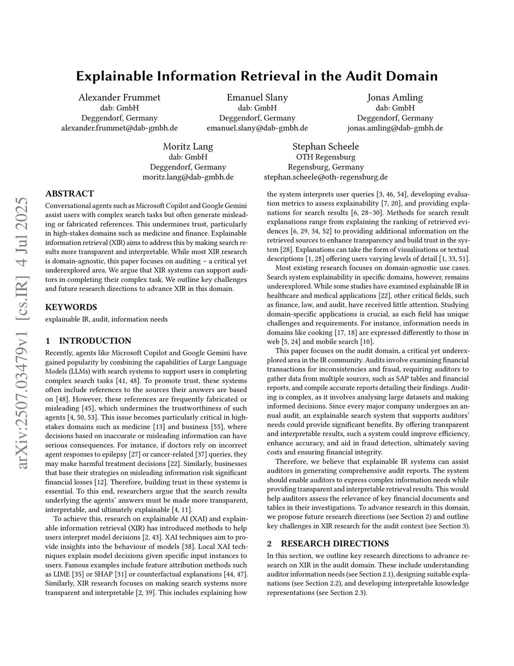 Conversational agents such as Microsoft Copilot and Google Gemini assist users with complex search tasks but often generate misleading or fabricated references. This undermines trust, particularly in high-stakes domains such as medicine and finance. Explainable information retrieval (XIR) aims to address this by making search results more transparent and interpretable. While most XIR research is domain-agnostic, this paper focuses on auditing -- a critical yet underexplored area. We argue that XIR systems can support auditors in completing their complex task. We outline key challenges and future research directions to advance XIR in this domain.