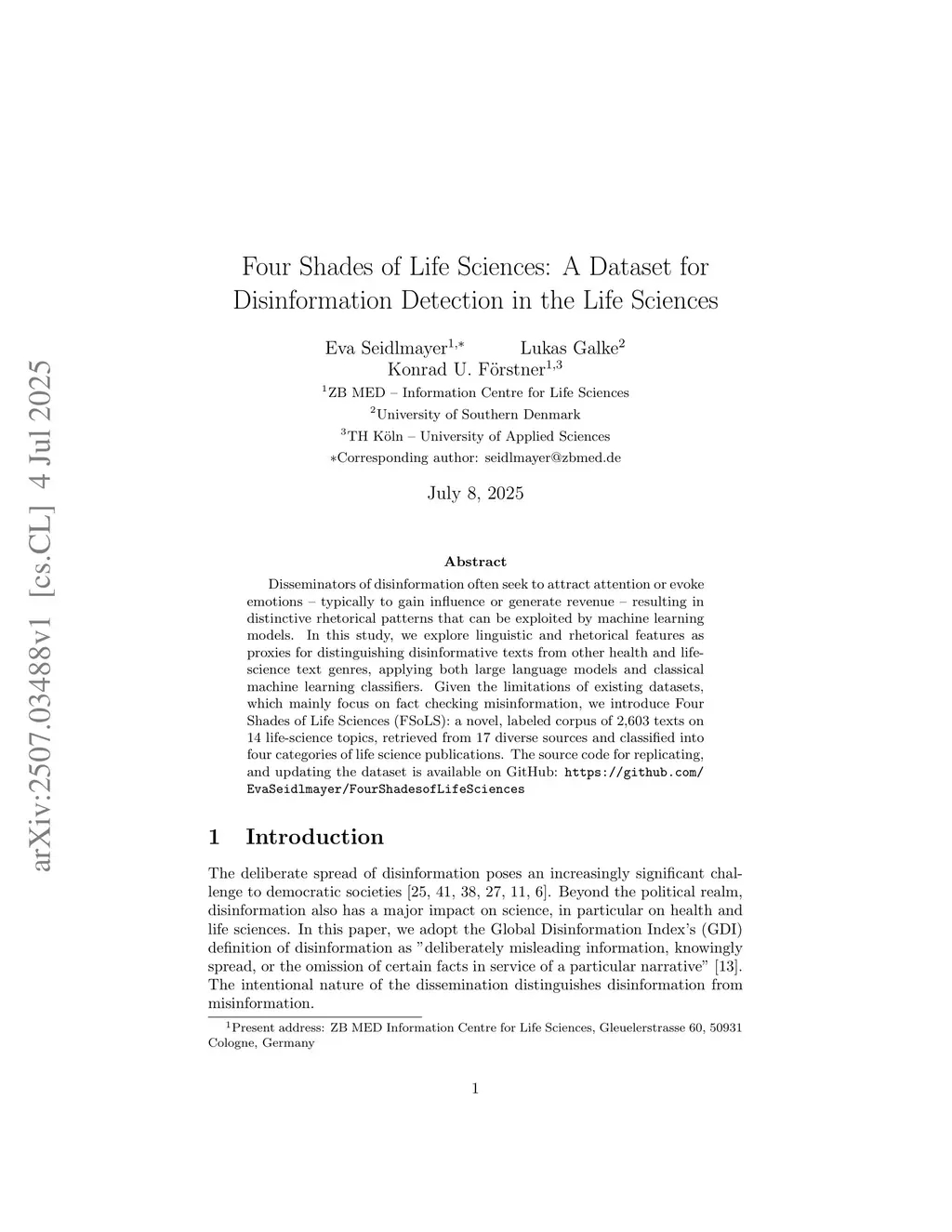 Disseminators of disinformation often seek to attract attention or evoke emotions - typically to gain influence or generate revenue - resulting in distinctive rhetorical patterns that can be exploited by machine learning models. In this study, we explore linguistic and rhetorical features as proxies for distinguishing disinformative texts from other health and life-science text genres, applying both large language models and classical machine learning classifiers. Given the limitations of existing datasets, which mainly focus on fact checking misinformation, we introduce Four Shades of Life Sciences (FSoLS): a novel, labeled corpus of 2,603 texts on 14 life-science topics, retrieved from 17 diverse sources and classified into four categories of life science publications. The source code for replicating, and updating the dataset is available on GitHub:this https URL