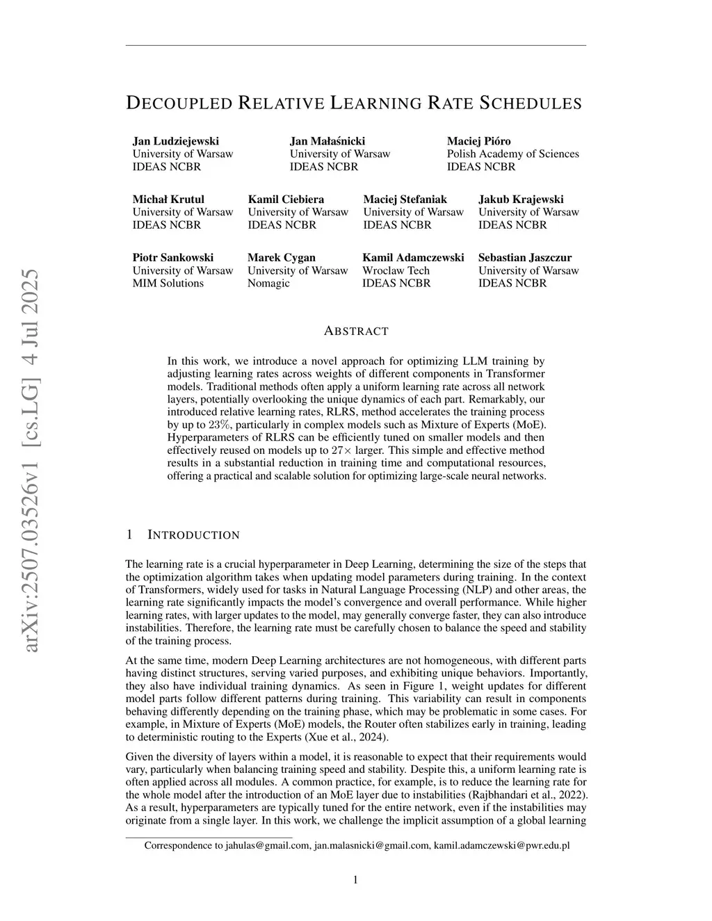 In this work, we introduce a novel approach for optimizing LLM training by adjusting learning rates across weights of different components in Transformer models. Traditional methods often apply a uniform learning rate across all network layers, potentially overlooking the unique dynamics of each part. Remarkably, our introduced relative learning rates, RLRS, method accelerates the training process by up to , particularly in complex models such as Mixture of Experts (MoE). Hyperparameters of RLRS can be efficiently tuned on smaller models and then effectively reused on models up to larger. This simple and effective method results in a substantial reduction in training time and computational resources, offering a practical and scalable solution for optimizing large-scale neural networks.