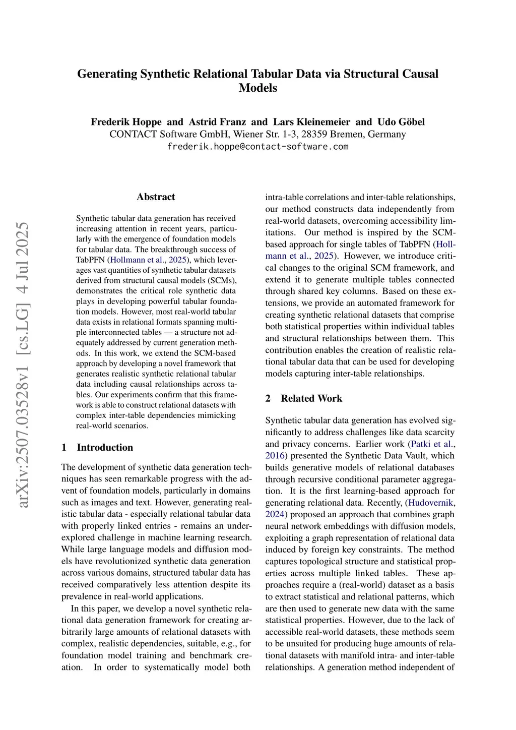 Synthetic tabular data generation has received increasing attention in recent years, particularly with the emergence of foundation models for tabular data. The breakthrough success of TabPFN (Hollmann et al.,2025), which leverages vast quantities of synthetic tabular datasets derived from structural causal models (SCMs), demonstrates the critical role synthetic data plays in developing powerful tabular foundation models. However, most real-world tabular data exists in relational formats spanning multiple interconnected tables - a structure not adequately addressed by current generation methods. In this work, we extend the SCM-based approach by developing a novel framework that generates realistic synthetic relational tabular data including causal relationships across tables. Our experiments confirm that this framework is able to construct relational datasets with complex inter-table dependencies mimicking real-world scenarios.