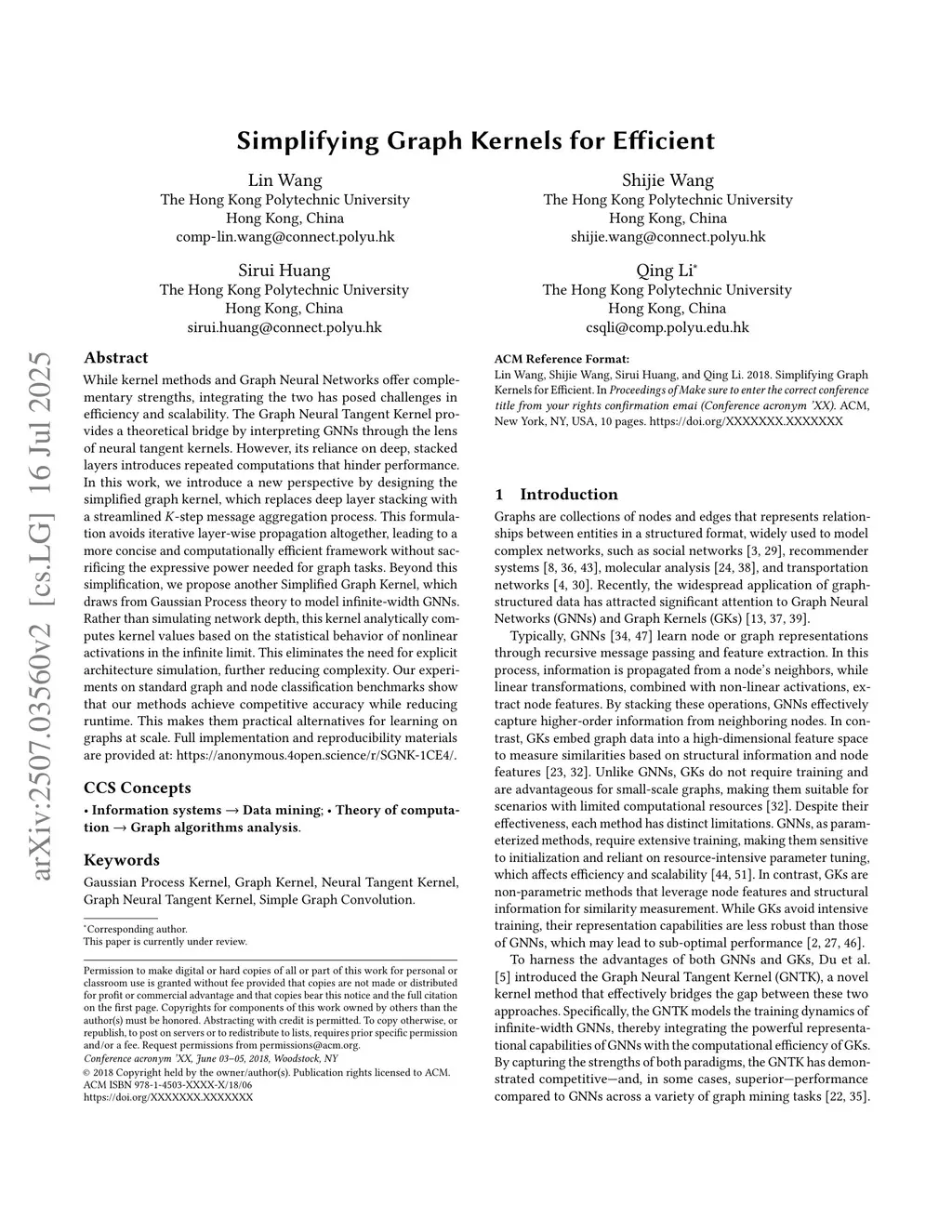 While kernel methods and Graph Neural Networks offer complementary strengths, integrating the two has posed challenges in efficiency and scalability. The Graph Neural Tangent Kernel provides a theoretical bridge by interpreting GNNs through the lens of neural tangent kernels. However, its reliance on deep, stacked layers introduces repeated computations that hinder performance. In this work, we introduce a new perspective by designing the simplified graph kernel, which replaces deep layer stacking with a streamlined -step message aggregation process. This formulation avoids iterative layer-wise propagation altogether, leading to a more concise and computationally efficient framework without sacrificing the expressive power needed for graph tasks. Beyond this simplification, we propose another Simplified Graph Kernel, which draws from Gaussian Process theory to model infinite-width GNNs. Rather than simulating network depth, this kernel analytically computes kernel values based on the statistical behavior of nonlinear activations in the infinite limit. This eliminates the need for explicit architecture simulation, further reducing complexity. Our experiments on standard graph and node classification benchmarks show that our methods achieve competitive accuracy while reducing runtime. This makes them practical alternatives for learning on graphs at scale. Full implementation and reproducibility materials are provided at:this https URL.