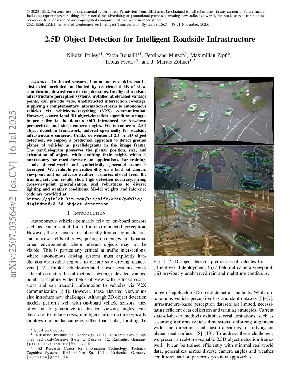 On-board sensors of autonomous vehicles can be obstructed, occluded, or limited by restricted fields of view, complicating downstream driving decisions. Intelligent roadside infrastructure perception systems, installed at elevated vantage points, can provide wide, unobstructed intersection coverage, supplying a complementary information stream to autonomous vehicles via vehicle-to-everything (V2X) communication. However, conventional 3D object-detection algorithms struggle to generalize under the domain shift introduced by top-down perspectives and steep camera angles. We introduce a 2.5D object detection framework, tailored specifically for infrastructure roadside-mounted cameras. Unlike conventional 2D or 3D object detection, we employ a prediction approach to detect ground planes of vehicles as parallelograms in the image frame. The parallelogram preserves the planar position, size, and orientation of objects while omitting their height, which is unnecessary for most downstream applications. For training, a mix of real-world and synthetically generated scenes is leveraged. We evaluate generalizability on a held-out camera viewpoint and in adverse-weather scenarios absent from the training set. Our results show high detection accuracy, strong cross-viewpoint generalization, and robustness to diverse lighting and weather conditions. Model weights and inference code are provided at:this https URL