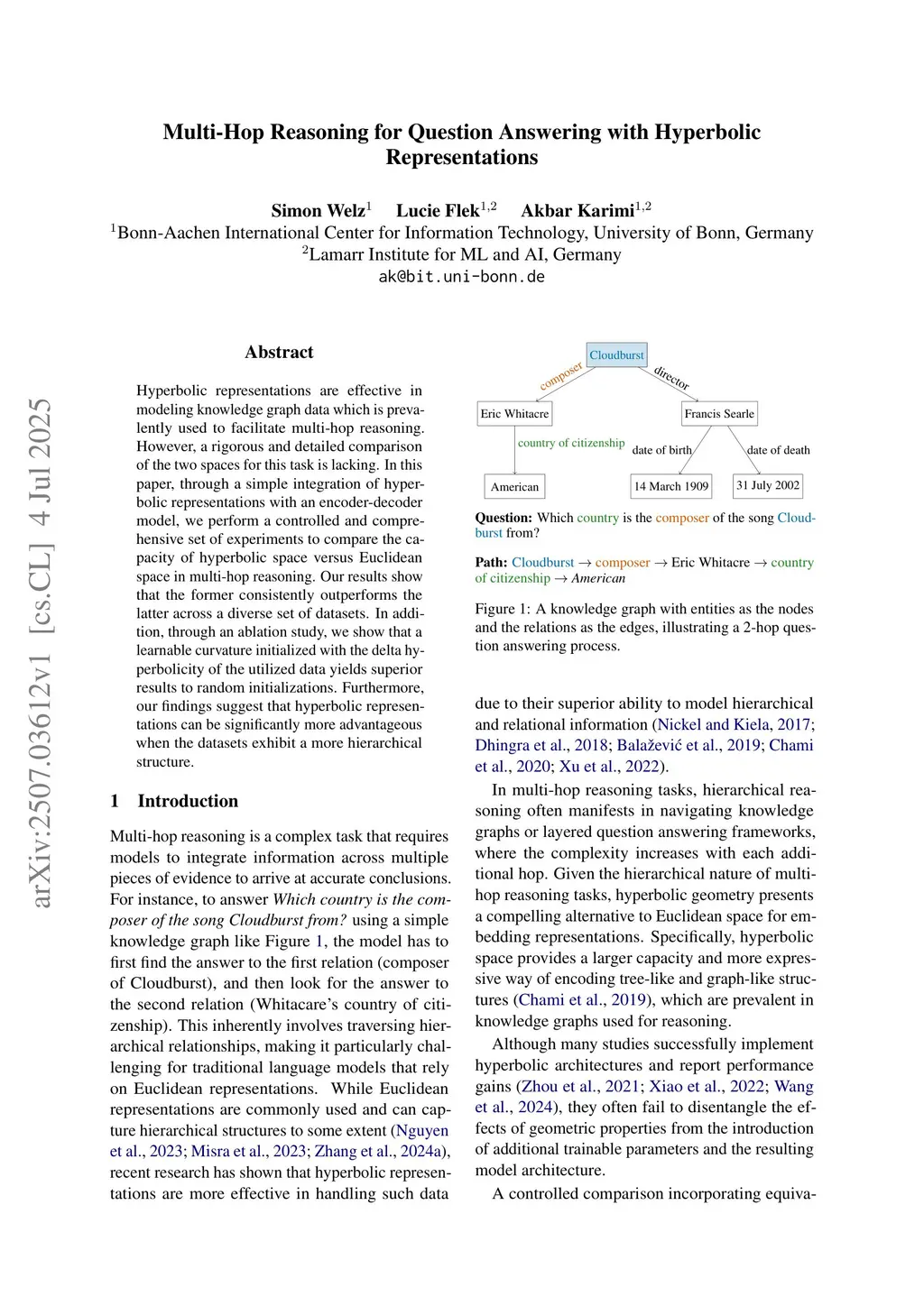 Multi-Hop Reasoning for Question Answering with Hyperbolic Representations