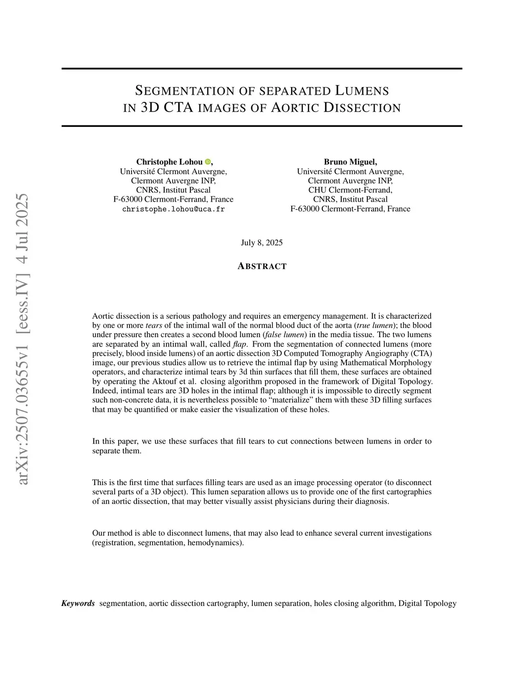 Aortic dissection is a serious pathology and requires an emergency management. It is characterized by one or more tears of the intimal wall of the normal blood duct of the aorta (true lumen); the blood under pressure then creates a second blood lumen (false lumen) in the media tissue. The two lumens are separated by an intimal wall, called flap. From the segmentation of connected lumens (more precisely, blood inside lumens) of an aortic dissection 3D Computed Tomography Angiography (CTA) image, our previous studies allow us to retrieve the intimal flap by using Mathematical Morphology operators, and characterize intimal tears by 3d thin surfaces that fill them, these surfaces are obtained by operating the Aktouf et al. closing algorithm proposed in the framework of Digital Topology. Indeed, intimal tears are 3D holes in the intimal flap; although it is impossible to directly segment such non-concrete data, it is nevertheless possible to "materialize" them with these 3D filling surfaces that may be quantified or make easier the visualization of these holes.In this paper, we use these surfaces that fill tears to cut connections between lumens in order to separate them.This is the first time that surfaces filling tears are used as an image processing operator (to disconnect several parts of a 3D object). This lumen separation allows us to provide one of the first cartographies of an aortic dissection, that may better visually assist physicians during their diagnosis.Our method is able to disconnect lumens, that may also lead to enhance several current investigations (registration, segmentation, hemodynamics).