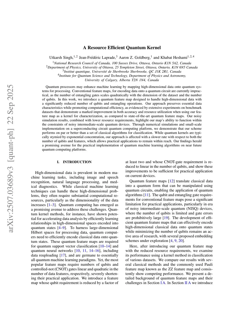 Quantum processors may enhance machine learning by mapping high-dimensional data onto quantum systems for processing. Conventional feature maps, for encoding data onto a quantum circuit are currently impractical, as the number of entangling gates scales quadratically with the dimension of the dataset and the number of qubits. In this work, we introduce a quantum feature map designed to handle high-dimensional data with a significantly reduced number of qubits and entangling operations. Our approach preserves essential data characteristics while promoting computational efficiency, as evidenced by extensive experiments on benchmark datasets that demonstrate a marked improvement in both accuracy and resource utilization when using our feature map as a kernel for characterization, as compared to state-of-the-art quantum feature maps. Our noisy simulation results, combined with lower resource requirements, highlight our map's ability to function within the constraints of noisy intermediate-scale quantum devices. Through numerical simulations and small-scale implementation on a superconducting circuit quantum computing platform, we demonstrate that our scheme performs on par or better than a set of classical algorithms for classification. While quantum kernels are typically stymied by exponential concentration, our approach is affected with a slower rate with respect to both the number of qubits and features, which allows practical applications to remain within reach. Our findings herald a promising avenue for the practical implementation of quantum machine learning algorithms on near future quantum computing platforms.