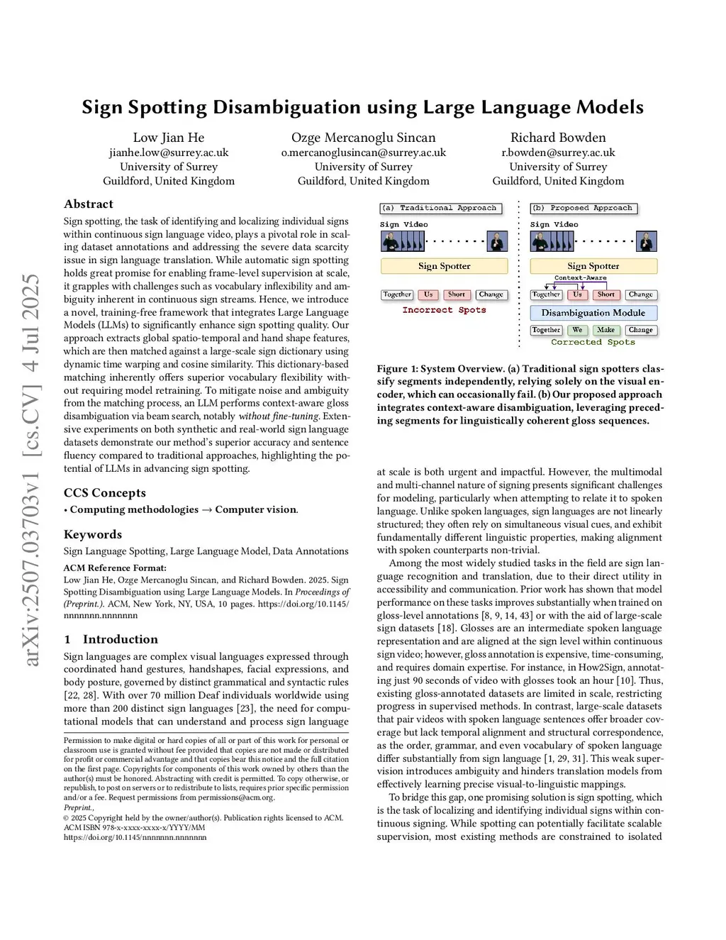 Sign spotting, the task of identifying and localizing individual signs within continuous sign language video, plays a pivotal role in scaling dataset annotations and addressing the severe data scarcity issue in sign language translation. While automatic sign spotting holds great promise for enabling frame-level supervision at scale, it grapples with challenges such as vocabulary inflexibility and ambiguity inherent in continuous sign streams. Hence, we introduce a novel, training-free framework that integrates Large Language Models (LLMs) to significantly enhance sign spotting quality. Our approach extracts global spatio-temporal and hand shape features, which are then matched against a large-scale sign dictionary using dynamic time warping and cosine similarity. This dictionary-based matching inherently offers superior vocabulary flexibility without requiring model retraining. To mitigate noise and ambiguity from the matching process, an LLM performs context-aware gloss disambiguation via beam search, notably without fine-tuning. Extensive experiments on both synthetic and real-world sign language datasets demonstrate our method's superior accuracy and sentence fluency compared to traditional approaches, highlighting the potential of LLMs in advancing sign spotting.