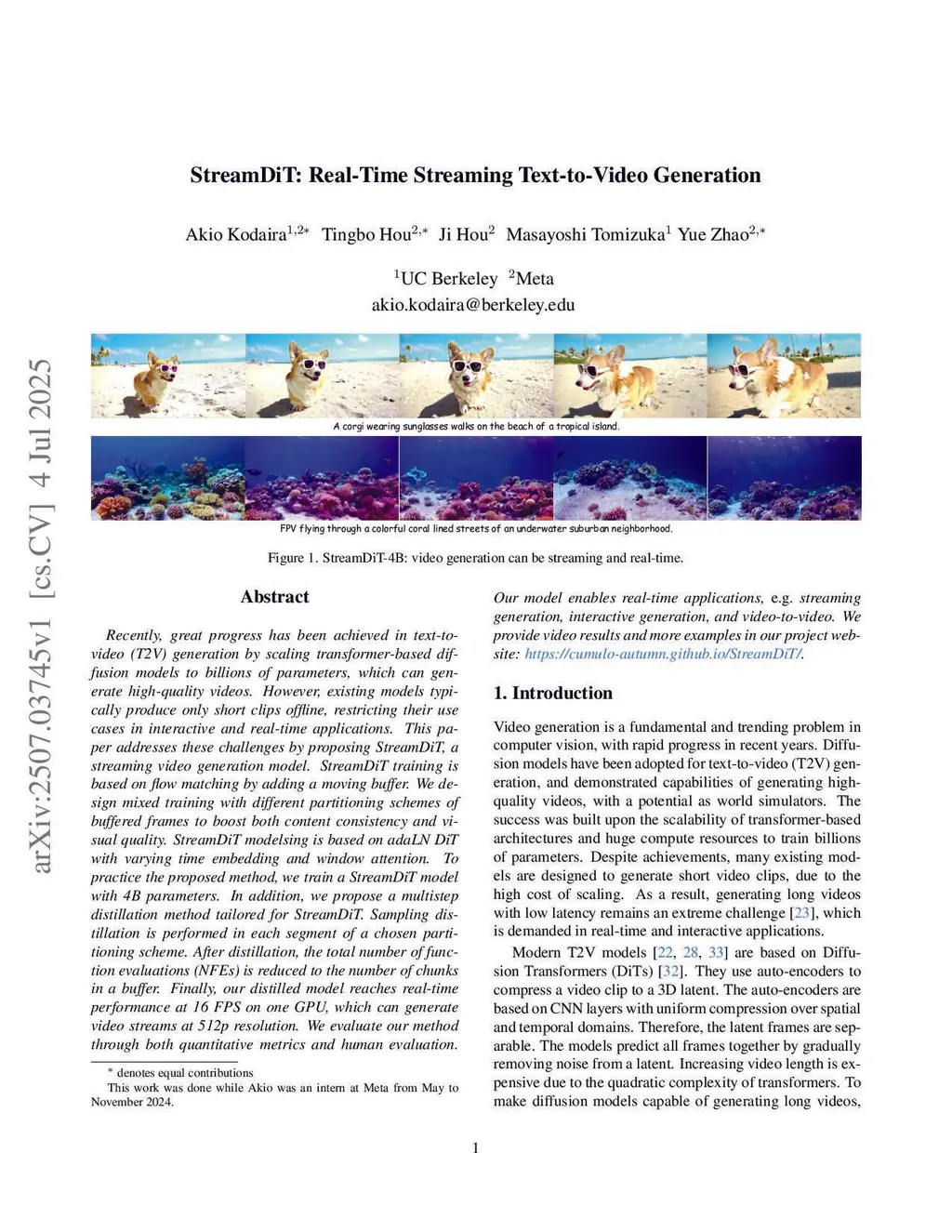 Recently, great progress has been achieved in text-to-video (T2V) generation by scaling transformer-based diffusion models to billions of parameters, which can generate high-quality videos. However, existing models typically produce only short clips offline, restricting their use cases in interactive and real-time applications. This paper addresses these challenges by proposing StreamDiT, a streaming video generation model. StreamDiT training is based on flow matching by adding a moving buffer. We design mixed training with different partitioning schemes of buffered frames to boost both content consistency and visual quality. StreamDiT modeling is based on adaLN DiT with varying time embedding and window attention. To practice the proposed method, we train a StreamDiT model with 4B parameters. In addition, we propose a multistep distillation method tailored for StreamDiT. Sampling distillation is performed in each segment of a chosen partitioning scheme. After distillation, the total number of function evaluations (NFEs) is reduced to the number of chunks in a buffer. Finally, our distilled model reaches real-time performance at 16 FPS on one GPU, which can generate video streams at 512p resolution. We evaluate our method through both quantitative metrics and human evaluation. Our model enables real-time applications, e.g. streaming generation, interactive generation, and video-to-video. We provide video results and more examples in our project website: <a href="this https URL https URL.</a>