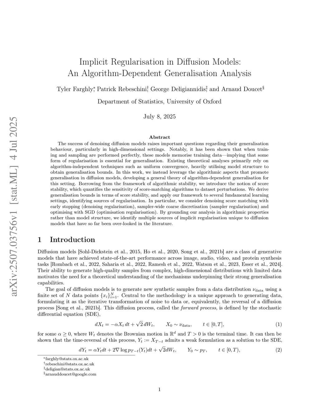 The success of denoising diffusion models raises important questions regarding their generalisation behaviour, particularly in high-dimensional settings. Notably, it has been shown that when training and sampling are performed perfectly, these models memorise training data -- implying that some form of regularisation is essential for generalisation. Existing theoretical analyses primarily rely on algorithm-independent techniques such as uniform convergence, heavily utilising model structure to obtain generalisation bounds. In this work, we instead leverage the algorithmic aspects that promote generalisation in diffusion models, developing a general theory of algorithm-dependent generalisation for this setting. Borrowing from the framework of algorithmic stability, we introduce the notion of score stability, which quantifies the sensitivity of score-matching algorithms to dataset perturbations. We derive generalisation bounds in terms of score stability, and apply our framework to several fundamental learning settings, identifying sources of regularisation. In particular, we consider denoising score matching with early stopping (denoising regularisation), sampler-wide coarse discretisation (sampler regularisation) and optimising with SGD (optimisation regularisation). By grounding our analysis in algorithmic properties rather than model structure, we identify multiple sources of implicit regularisation unique to diffusion models that have so far been overlooked in the literature.