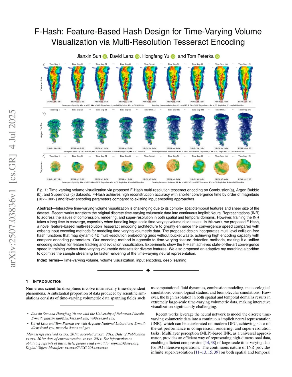 F-Hash: Feature-Based Hash Design for Time-Varying Volume Visualization via Multi-Resolution Tesseract Encoding