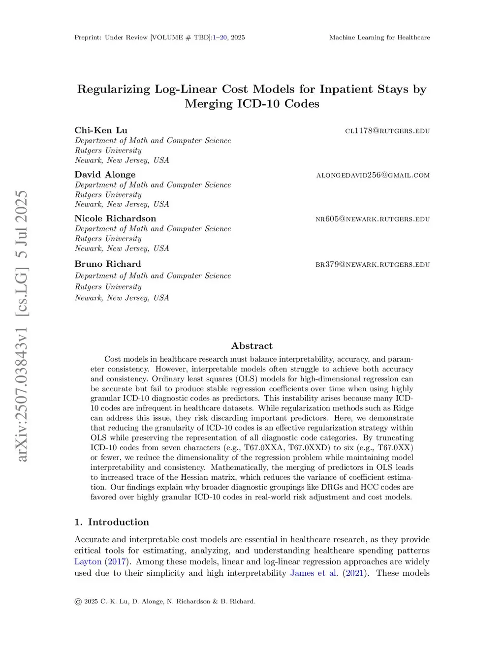 Cost models in healthcare research must balance interpretability, accuracy, and parameter consistency. However, interpretable models often struggle to achieve both accuracy and consistency. Ordinary least squares (OLS) models for high-dimensional regression can be accurate but fail to produce stable regression coefficients over time when using highly granular ICD-10 diagnostic codes as predictors. This instability arises because many ICD-10 codes are infrequent in healthcare datasets. While regularization methods such as Ridge can address this issue, they risk discarding important predictors. Here, we demonstrate that reducing the granularity of ICD-10 codes is an effective regularization strategy within OLS while preserving the representation of all diagnostic code categories. By truncating ICD-10 codes from seven characters to six or fewer, we reduce the dimensionality of the regression problem while maintaining model interpretability and consistency. Mathematically, the merging of predictors in OLS leads to increased trace of the Hessian matrix, which reduces the variance of coefficient estimation. Our findings explain why broader diagnostic groupings like DRGs and HCC codes are favored over highly granular ICD-10 codes in real-world risk adjustment and cost models.