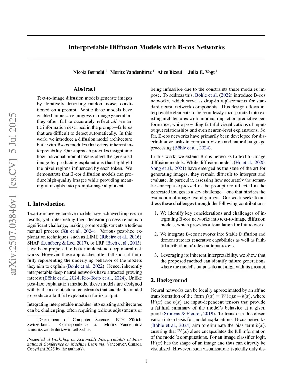Text-to-image diffusion models generate images by iteratively denoising random noise, conditioned on a prompt. While these models have enabled impressive progress in image generation, they often fail to accurately reflect all semantic information described in the prompt -- failures that are difficult to detect automatically. In this work, we introduce a diffusion model architecture built with B-cos modules that offers inherent interpretability. Our approach provides insight into how individual prompt tokens affect the generated image by producing explanations that highlight the pixel regions influenced by each token. We demonstrate that B-cos diffusion models can produce high-quality images while providing meaningful insights into prompt-image alignment.