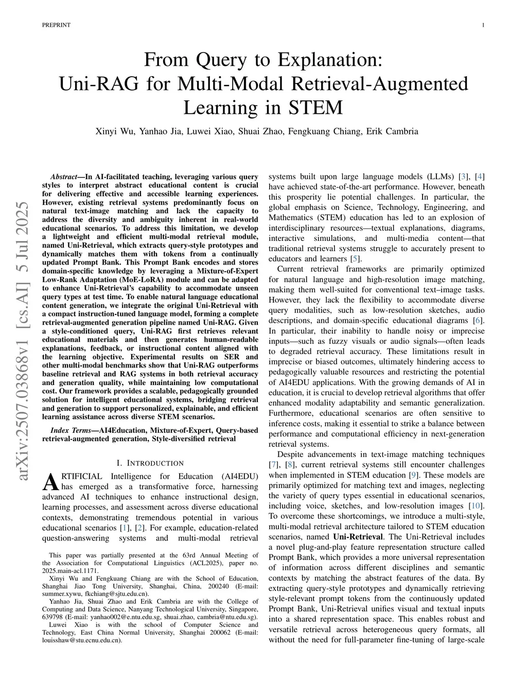 In AI-facilitated teaching, leveraging various query styles to interpret abstract educational content is crucial for delivering effective and accessible learning experiences. However, existing retrieval systems predominantly focus on natural text-image matching and lack the capacity to address the diversity and ambiguity inherent in real-world educational scenarios. To address this limitation, we develop a lightweight and efficient multi-modal retrieval module, named Uni-Retrieval, which extracts query-style prototypes and dynamically matches them with tokens from a continually updated Prompt Bank. This Prompt Bank encodes and stores domain-specific knowledge by leveraging a Mixture-of-Expert Low-Rank Adaptation (MoE-LoRA) module and can be adapted to enhance Uni-Retrieval's capability to accommodate unseen query types at test time. To enable natural language educational content generation, we integrate the original Uni-Retrieval with a compact instruction-tuned language model, forming a complete retrieval-augmented generation pipeline named Uni-RAG. Given a style-conditioned query, Uni-RAG first retrieves relevant educational materials and then generates human-readable explanations, feedback, or instructional content aligned with the learning objective. Experimental results on SER and other multi-modal benchmarks show that Uni-RAG outperforms baseline retrieval and RAG systems in both retrieval accuracy and generation quality, while maintaining low computational cost. Our framework provides a scalable, pedagogically grounded solution for intelligent educational systems, bridging retrieval and generation to support personalized, explainable, and efficient learning assistance across diverse STEM scenarios.