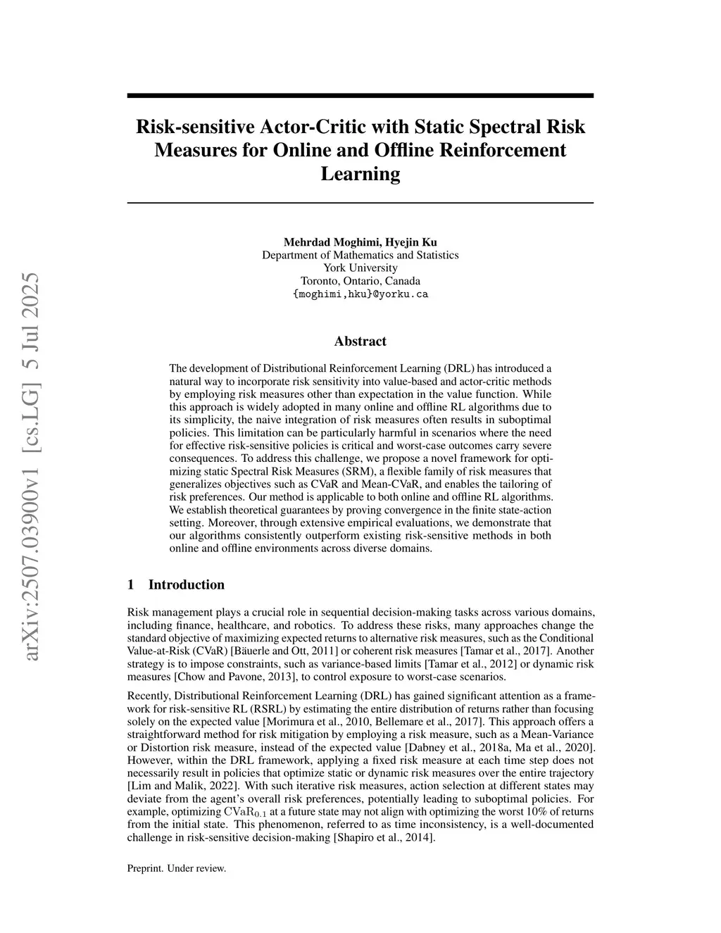 Risk-sensitive Actor-Critic with Static Spectral Risk Measures for Online and Offline Reinforcement Learning