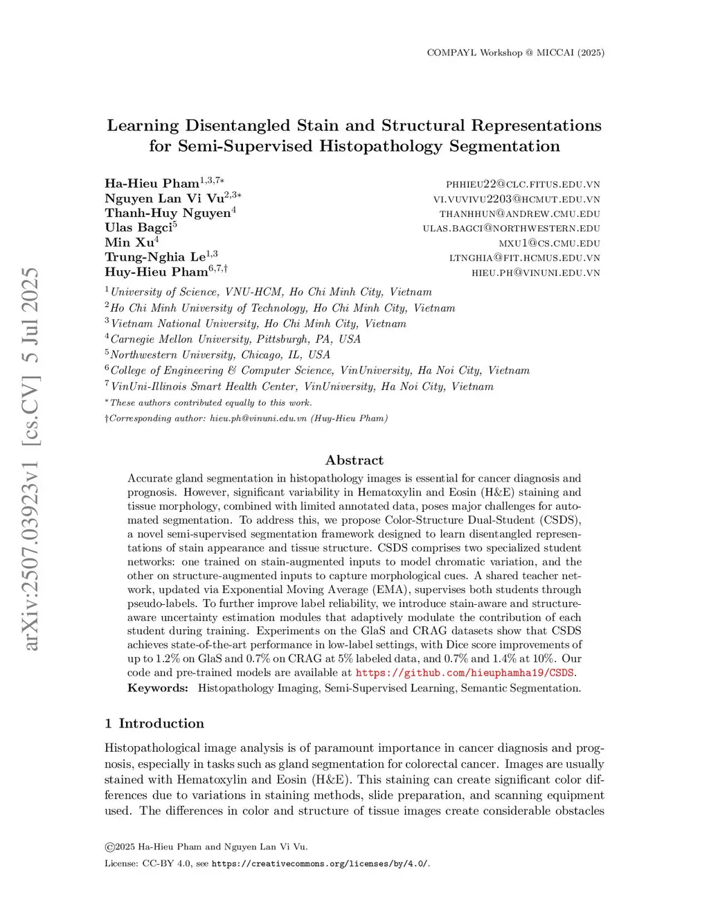 Accurate gland segmentation in histopathology images is essential for cancer diagnosis and prognosis. However, significant variability in Hematoxylin and Eosin (H&E) staining and tissue morphology, combined with limited annotated data, poses major challenges for automated segmentation. To address this, we propose Color-Structure Dual-Student (CSDS), a novel semi-supervised segmentation framework designed to learn disentangled representations of stain appearance and tissue structure. CSDS comprises two specialized student networks: one trained on stain-augmented inputs to model chromatic variation, and the other on structure-augmented inputs to capture morphological cues. A shared teacher network, updated via Exponential Moving Average (EMA), supervises both students through pseudo-labels. To further improve label reliability, we introduce stain-aware and structure-aware uncertainty estimation modules that adaptively modulate the contribution of each student during training. Experiments on the GlaS and CRAG datasets show that CSDS achieves state-of-the-art performance in low-label settings, with Dice score improvements of up to 1.2% on GlaS and 0.7% on CRAG at 5% labeled data, and 0.7% and 1.4% at 10%. Our code and pre-trained models are available atthis https URL.