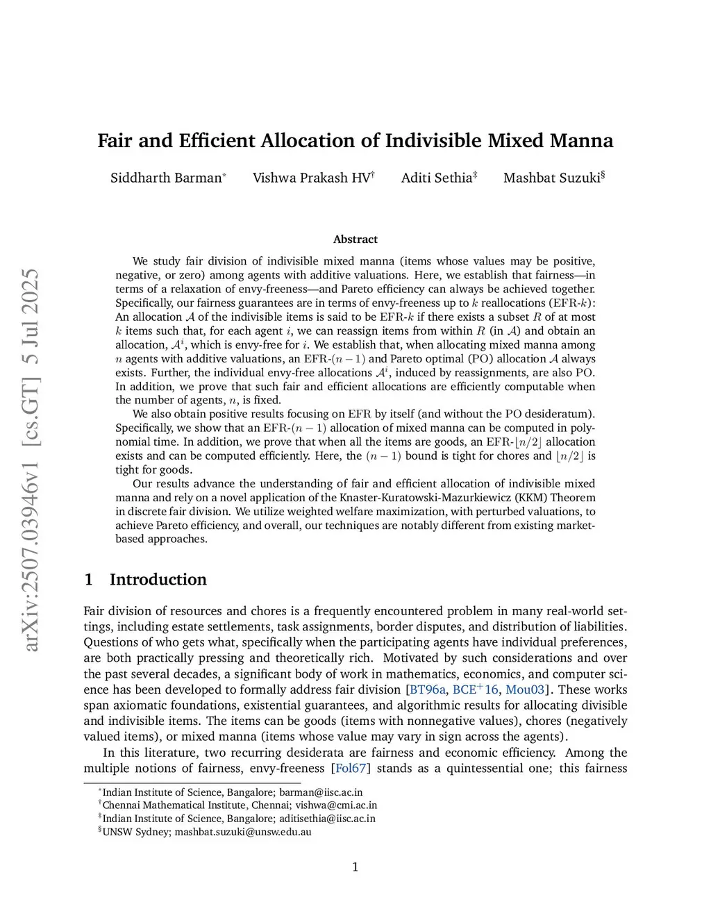 We study fair division of indivisible mixed manna (items whose values may be positive, negative, or zero) among agents with additive valuations. Here, we establish that fairness -- in terms of a relaxation of envy-freeness -- and Pareto efficiency can always be achieved together. Specifically, our fairness guarantees are in terms of envy-freeness up to reallocations (EFR-): An allocation of the indivisible items is said to be EFR- if there exists a subset of at most items such that, for each agent , we can reassign items from within (in ) and obtain an allocation, , which is envy-free for . We establish that, when allocating mixed manna among agents with additive valuations, an EFR- and Pareto optimal (PO) allocation always exists. Further, the individual envy-free allocations , induced by reassignments, are also PO. In addition, we prove that such fair and efficient allocations are efficiently computable when the number of agents, , is fixed.We also obtain positive results focusing on EFR by itself (and without the PO desideratum). Specifically, we show that an EFR- allocation of mixed manna can be computed in polynomial time. In addition, we prove that when all the items are goods, an EFR- allocation exists and can be computed efficiently. Here, the bound is tight for chores and is tight for goods.Our results advance the understanding of fair and efficient allocation of indivisible mixed manna and rely on a novel application of the Knaster-Kuratowski-Mazurkiewicz (KKM) Theorem in discrete fair division. We utilize weighted welfare maximization, with perturbed valuations, to achieve Pareto efficiency, and overall, our techniques are notably different from existing market-based approaches.