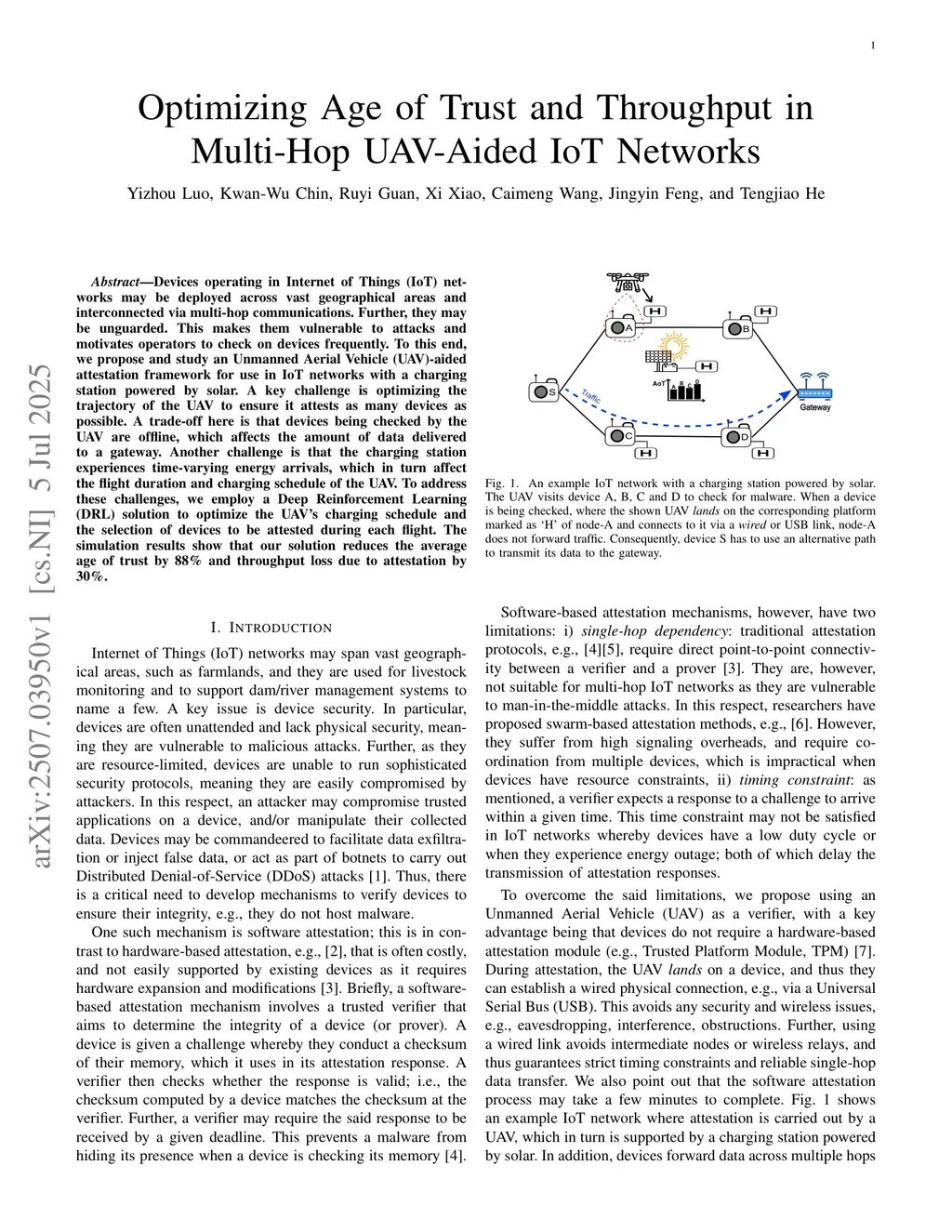 Devices operating in Internet of Things (IoT) networks may be deployed across vast geographical areas and interconnected via multi-hop communications. Further, they may be unguarded. This makes them vulnerable to attacks and motivates operators to check on devices frequently. To this end, we propose and study an Unmanned Aerial Vehicle (UAV)-aided attestation framework for use in IoT networks with a charging station powered by solar. A key challenge is optimizing the trajectory of the UAV to ensure it attests as many devices as possible. A trade-off here is that devices being checked by the UAV are offline, which affects the amount of data delivered to a gateway. Another challenge is that the charging station experiences time-varying energy arrivals, which in turn affect the flight duration and charging schedule of the UAV. To address these challenges, we employ a Deep Reinforcement Learning (DRL) solution to optimize the UAV's charging schedule and the selection of devices to be attested during each flight. The simulation results show that our solution reduces the average age of trust by 88% and throughput loss due to attestation by 30%.