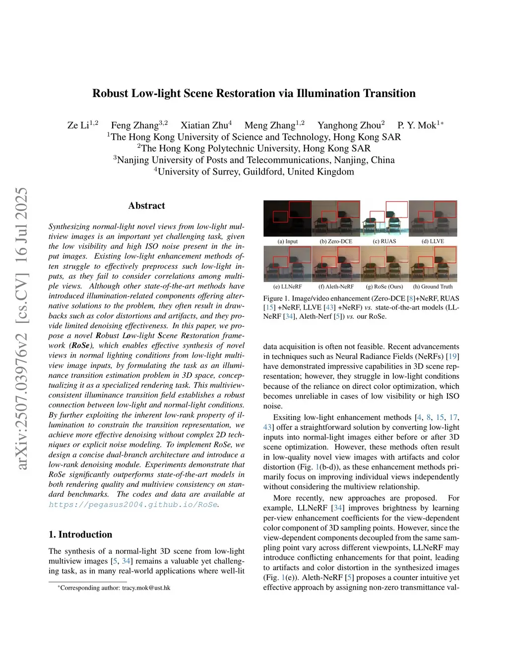 Synthesizing normal-light novel views from low-light multiview images is an important yet challenging task, given the low visibility and high ISO noise present in the input images. Existing low-light enhancement methods often struggle to effectively preprocess such low-light inputs, as they fail to consider correlations among multiple views. Although other state-of-the-art methods have introduced illumination-related components offering alternative solutions to the problem, they often result in drawbacks such as color distortions and artifacts, and they provide limited denoising effectiveness. In this paper, we propose a novel Robust Low-light Scene Restoration framework (RoSe), which enables effective synthesis of novel views in normal lighting conditions from low-light multiview image inputs, by formulating the task as an illuminance transition estimation problem in 3D space, conceptualizing it as a specialized rendering task. This multiview-consistent illuminance transition field establishes a robust connection between low-light and normal-light conditions. By further exploiting the inherent low-rank property of illumination to constrain the transition representation, we achieve more effective denoising without complex 2D techniques or explicit noise modeling. To implement RoSe, we design a concise dual-branch architecture and introduce a low-rank denoising module. Experiments demonstrate that RoSe significantly outperforms state-of-the-art models in both rendering quality and multiview consistency on standard benchmarks. The codes and data are available atthis https URL.