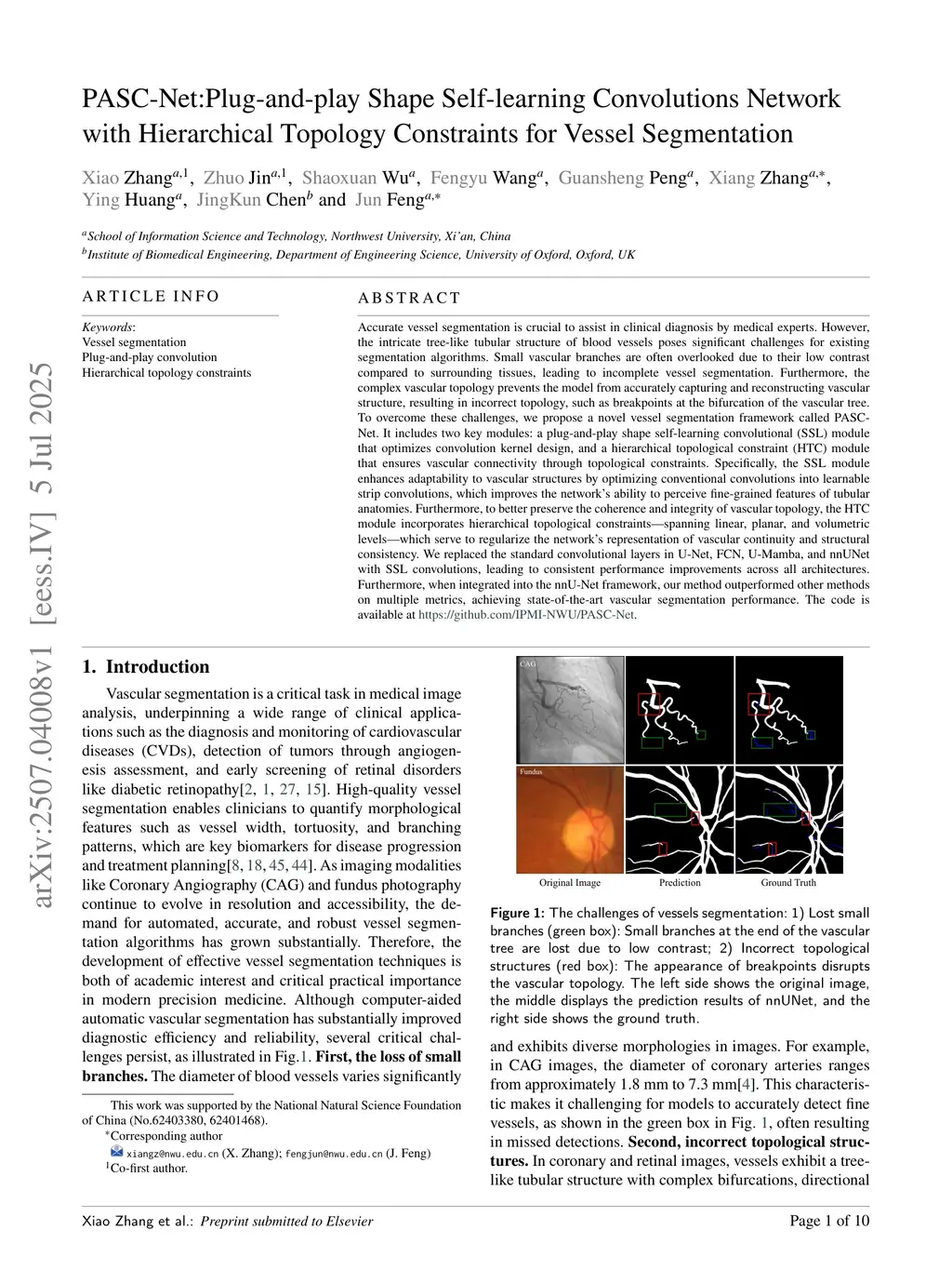 PASC-Net:Plug-and-play Shape Self-learning Convolutions Network with Hierarchical Topology Constraints for Vessel Segmentation