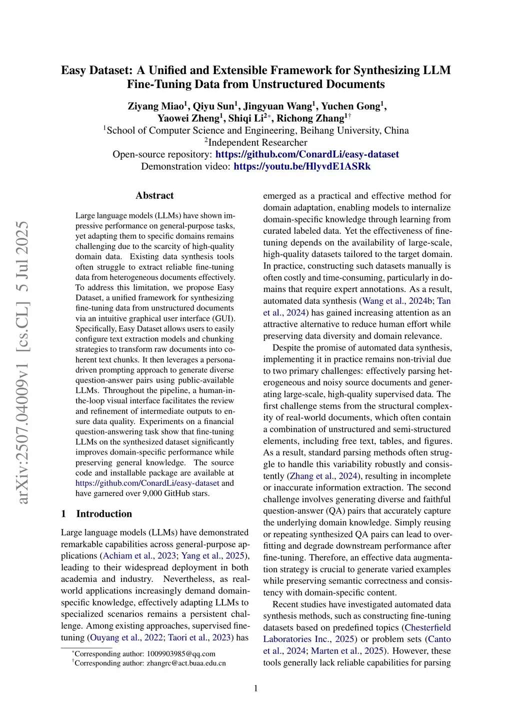 Easy Dataset: A Unified and Extensible Framework for Synthesizing LLM Fine-Tuning Data from Unstructured Documents