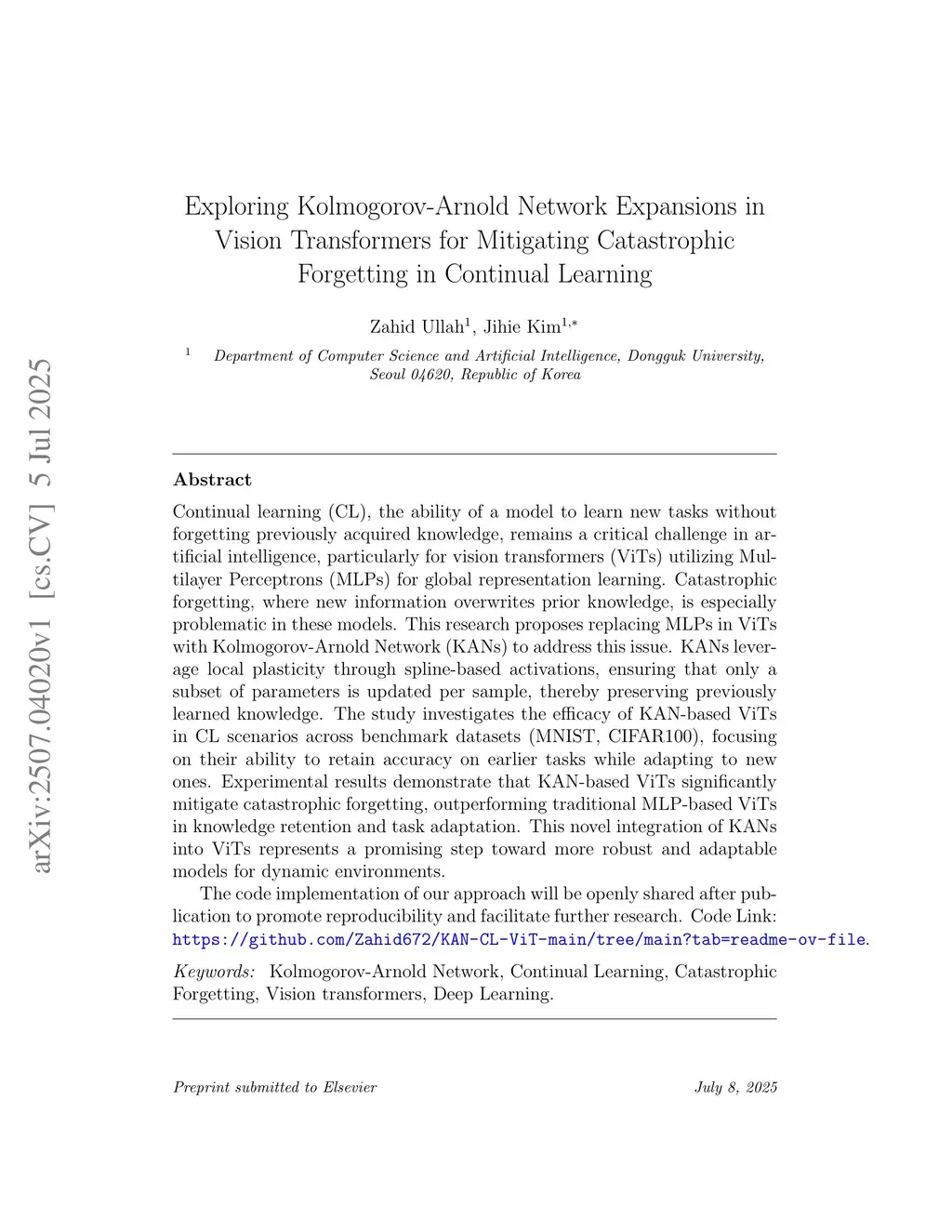 Continual learning (CL), the ability of a model to learn new tasks without forgetting previously acquired knowledge, remains a critical challenge in artificial intelligence, particularly for vision transformers (ViTs) utilizing Multilayer Perceptrons (MLPs) for global representation learning. Catastrophic forgetting, where new information overwrites prior knowledge, is especially problematic in these models. This research proposes replacing MLPs in ViTs with Kolmogorov-Arnold Network (KANs) to address this issue. KANs leverage local plasticity through spline-based activations, ensuring that only a subset of parameters is updated per sample, thereby preserving previously learned knowledge. The study investigates the efficacy of KAN-based ViTs in CL scenarios across benchmark datasets (MNIST, CIFAR100), focusing on their ability to retain accuracy on earlier tasks while adapting to new ones. Experimental results demonstrate that KAN-based ViTs significantly mitigate catastrophic forgetting, outperforming traditional MLP-based ViTs in knowledge retention and task adaptation. This novel integration of KANs into ViTs represents a promising step toward more robust and adaptable models for dynamic environments.