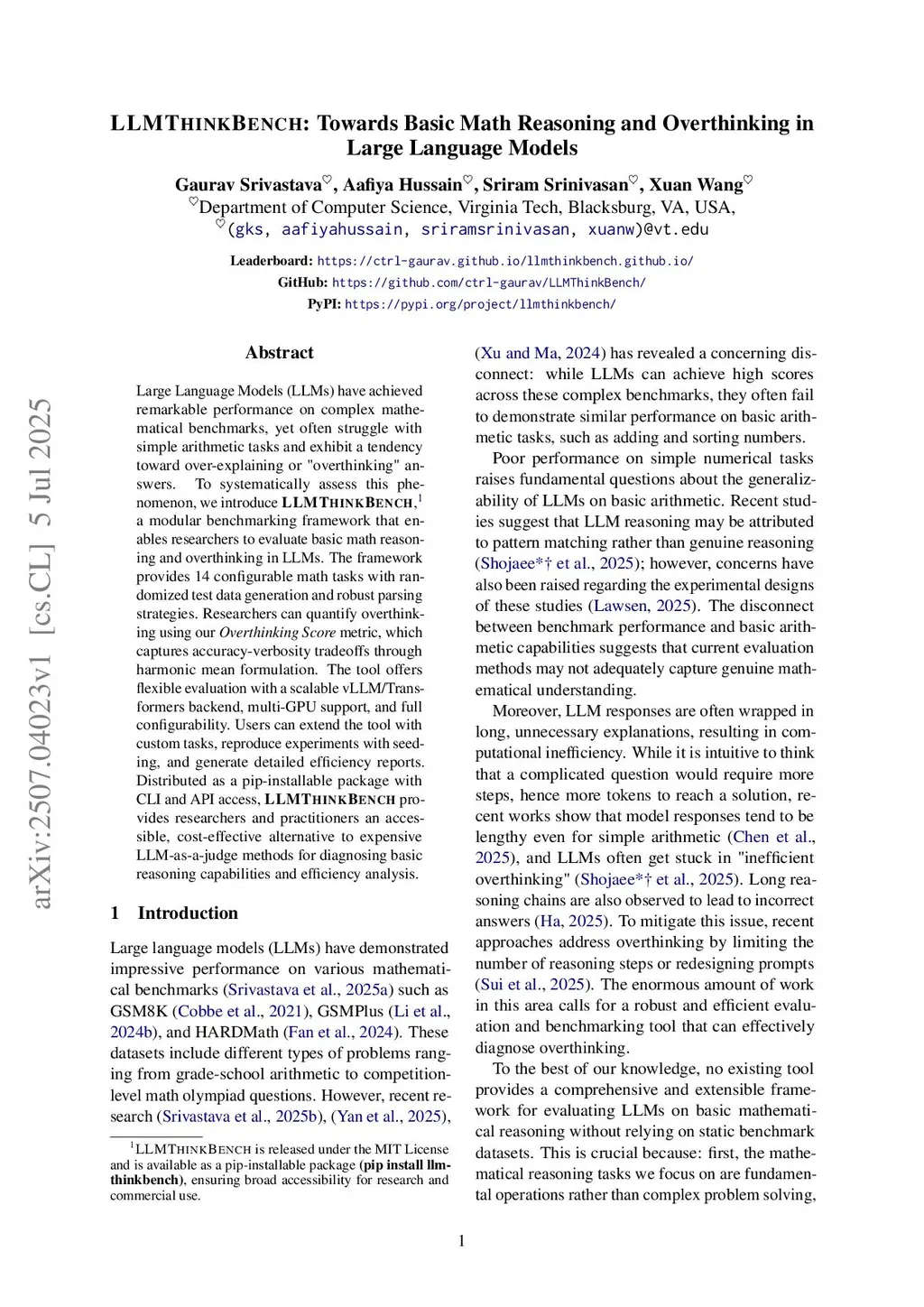 Large language models (LLMs) achieve impressive performance on complex mathematical benchmarks yet sometimes fail on basic math reasoning while generating unnecessarily verbose responses. In this paper, we present a systematic benchmark and comprehensive empirical study to evaluate the efficiency of reasoning in LLMs, focusing on the fundamental tradeoff between accuracy and overthinking. First, we formalize the accuracy-verbosity tradeoff. Second, we introduce the Overthinking Score, a harmonic-mean metric combining accuracy and token-efficiency for holistic model evaluation. Third, we establish an evaluation protocol with dynamically-generated data across 14 basic math tasks. Fourth, we conduct a large-scale empirical study evaluating 53 LLMs, including reasoning and quantized variants across different reasoning budgets. Our findings reveal: 1) model performance on complex benchmarks does not translate directly to basic math reasoning; 2) reasoning models generate ~18 more tokens while sometimes achieving lower accuracy and exhibit catastrophic collapse when token is constrained, dropping by ~28; 3) the accuracy-verbosity relationship is non-monotonic with extended reasoning budgets yielding diminishing returns (GPT-5/o-series models show zero accuracy gain from low -> medium -> high reasoning effort). Our findings challenge the assumption that longer reasoning in LLMs necessarily improves mathematical reasoning.