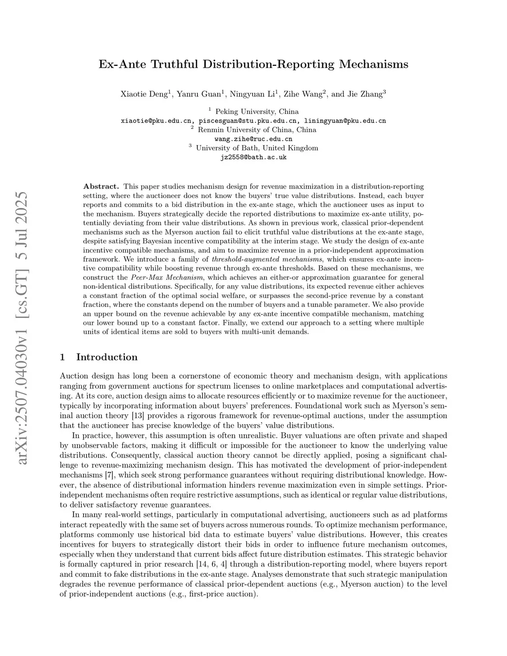 This paper studies mechanism design for revenue maximization in a distribution-reporting setting, where the auctioneer does not know the buyers' true value distributions. Instead, each buyer reports and commits to a bid distribution in the ex-ante stage, which the auctioneer uses as input to the mechanism. Buyers strategically decide the reported distributions to maximize ex-ante utility, potentially deviating from their value distributions. As shown in previous work, classical prior-dependent mechanisms such as the Myerson auction fail to elicit truthful value distributions at the ex-ante stage, despite satisfying Bayesian incentive compatibility at the interim stage. We study the design of ex-ante incentive compatible mechanisms, and aim to maximize revenue in a prior-independent approximation framework. We introduce a family of threshold-augmented mechanisms, which ensures ex-ante incentive compatibility while boosting revenue through ex-ante thresholds. Based on these mechanisms, we construct the Peer-Max Mechanism, which achieves an either-or approximation guarantee for general non-identical distributions. Specifically, for any value distributions, its expected revenue either achieves a constant fraction of the optimal social welfare, or surpasses the second-price revenue by a constant fraction, where the constants depend on the number of buyers and a tunable parameter. We also provide an upper bound on the revenue achievable by any ex-ante incentive compatible mechanism, matching our lower bound up to a constant factor. Finally, we extend our approach to a setting where multiple units of identical items are sold to buyers with multi-unit demands.