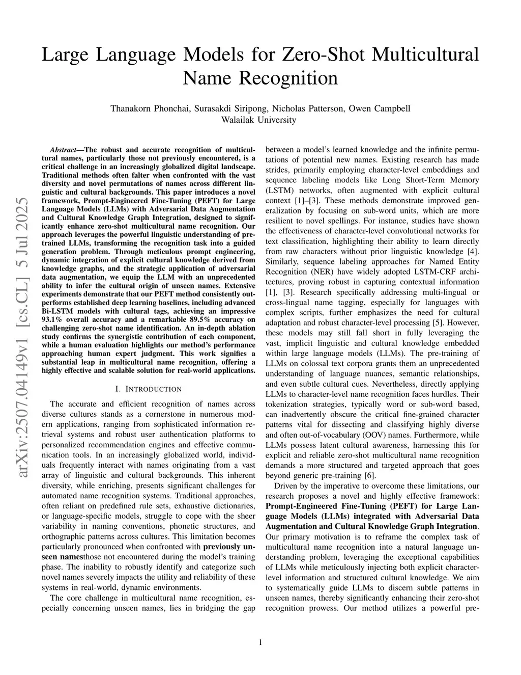 The robust and accurate recognition of multicultural names, particularly those not previously encountered, is a critical challenge in an increasingly globalized digital landscape. Traditional methods often falter when confronted with the vast diversity and novel permutations of names across different linguistic and cultural backgrounds. This paper introduces a novel framework, Prompt-Engineered Fine-Tuning (PEFT) for Large Language Models (LLMs) with Adversarial Data Augmentation and Cultural Knowledge Graph Integration, designed to significantly enhance zero-shot multicultural name recognition. Our approach leverages the powerful linguistic understanding of pre-trained LLMs, transforming the recognition task into a guided generation problem. Through meticulous prompt engineering, dynamic integration of explicit cultural knowledge derived from knowledge graphs, and the strategic application of adversarial data augmentation, we equip the LLM with an unprecedented ability to infer the cultural origin of unseen names. Extensive experiments demonstrate that our PEFT method consistently outperforms established deep learning baselines, including advanced Bi-LSTM models with cultural tags, achieving an impressive 93.1\% overall accuracy and a remarkable 89.5\% accuracy on challenging zero-shot name identification. An in-depth ablation study confirms the synergistic contribution of each component, while a human evaluation highlights our method's performance approaching human expert judgment. This work signifies a substantial leap in multicultural name recognition, offering a highly effective and scalable solution for real-world applications.