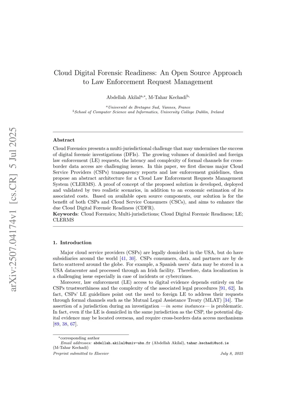 Cloud Forensics presents a multi-jurisdictional challenge that may undermines the success of digital forensic investigations (DFIs). The growing volumes of domiciled and foreign law enforcement (LE) requests, the latency and complexity of formal channels for crossborder data access are challenging issues. In this paper, we first discuss major Cloud Service Providers (CSPs) transparency reports and law enforcement guidelines, then propose an abstract architecture for a Cloud Law Enforcement Requests Management System (CLERMS). A proof of concept of the proposed solution is developed, deployed and validated by two realistic scenarios, in addition to an economic estimation of its associated costs. Based on available open source components, our solution is for the benefit of both CSPs and Cloud Service Consumers (CSCs), and aims to enhance the due Cloud Digital Forensic Readiness (CDFR).