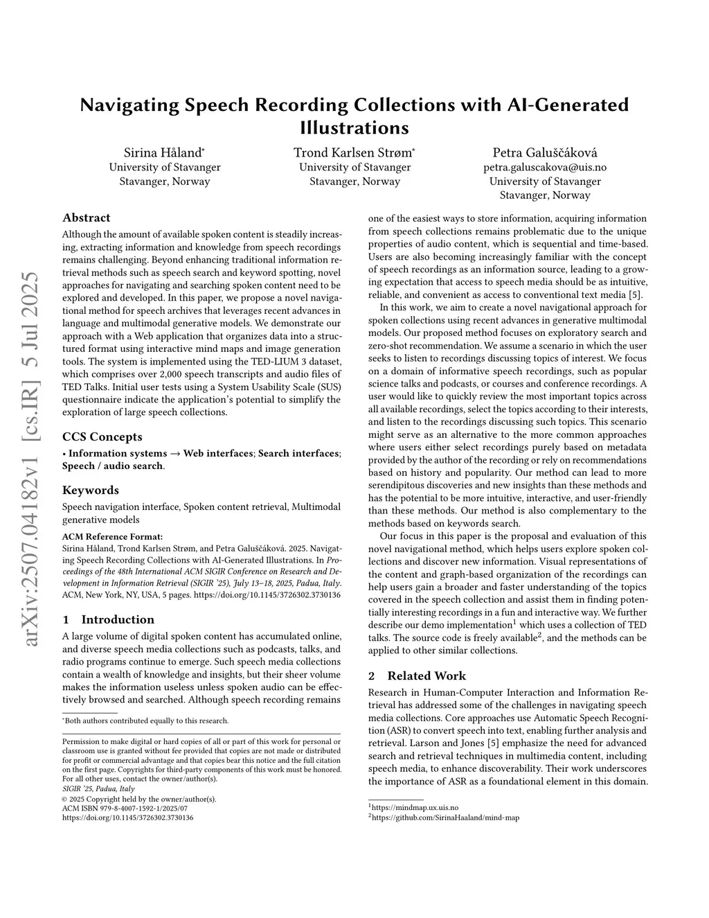Although the amount of available spoken content is steadily increasing, extracting information and knowledge from speech recordings remains challenging. Beyond enhancing traditional information retrieval methods such as speech search and keyword spotting, novel approaches for navigating and searching spoken content need to be explored and developed. In this paper, we propose a novel navigational method for speech archives that leverages recent advances in language and multimodal generative models. We demonstrate our approach with a Web application that organizes data into a structured format using interactive mind maps and image generation tools. The system is implemented using the TED-LIUM~3 dataset, which comprises over 2,000 speech transcripts and audio files of TED Talks. Initial user tests using a System Usability Scale (SUS) questionnaire indicate the application's potential to simplify the exploration of large speech collections.