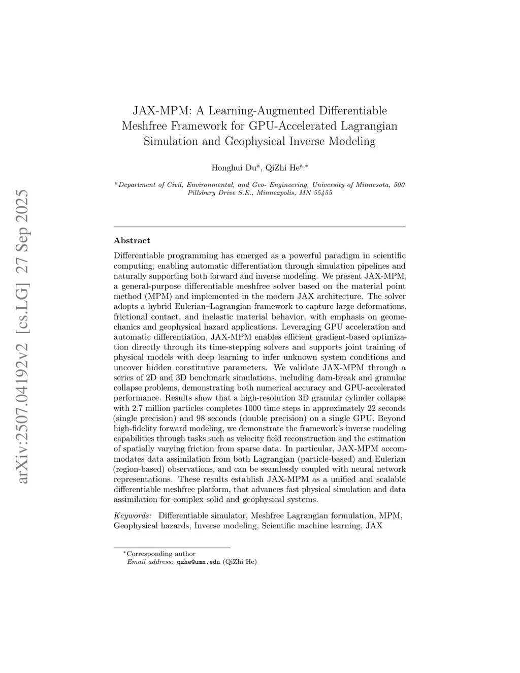 Differentiable programming has emerged as a powerful paradigm in scientific computing, enabling automatic differentiation through simulation pipelines and naturally supporting both forward and inverse modeling. We present JAX-MPM, a general-purpose differentiable meshfree solver based on the material point method (MPM) and implemented in the modern JAX architecture. The solver adopts a hybrid Eulerian-Lagrangian framework to capture large deformations, frictional contact, and inelastic material behavior, with emphasis on geomechanics and geophysical hazard applications. Leveraging GPU acceleration and automatic differentiation, JAX-MPM enables efficient gradient-based optimization directly through its time-stepping solvers and supports joint training of physical models with deep learning to infer unknown system conditions and uncover hidden constitutive parameters. We validate JAX-MPM through a series of 2D and 3D benchmark simulations, including dam-break and granular collapse problems, demonstrating both numerical accuracy and GPU-accelerated performance. Results show that a high-resolution 3D granular cylinder collapse with 2.7 million particles completes 1000 time steps in approximately 22 seconds (single precision) and 98 seconds (double precision) on a single GPU. Beyond high-fidelity forward modeling, we demonstrate the framework's inverse modeling capabilities through tasks such as velocity field reconstruction and the estimation of spatially varying friction from sparse data. In particular, JAX-MPM accommodates data assimilation from both Lagrangian (particle-based) and Eulerian (region-based) observations, and can be seamlessly coupled with neural network representations. These results establish JAX-MPM as a unified and scalable differentiable meshfree platform that advances fast physical simulation and data assimilation for complex solid and geophysical systems.