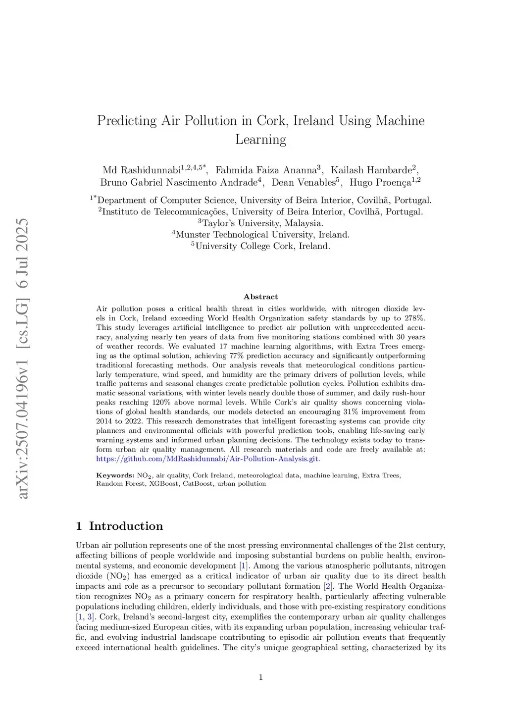 Air pollution poses a critical health threat in cities worldwide, with nitrogen dioxide levels in Cork, Ireland exceeding World Health Organization safety standards by up to . This study leverages artificial intelligence to predict air pollution with unprecedented accuracy, analyzing nearly ten years of data from five monitoring stations combined with 30 years of weather records. We evaluated 17 machine learning algorithms, with Extra Trees emerging as the optimal solution, achieving prediction accuracy and significantly outperforming traditional forecasting methods. Our analysis reveals that meteorological conditions particularly temperature, wind speed, and humidity are the primary drivers of pollution levels, while traffic patterns and seasonal changes create predictable pollution cycles. Pollution exhibits dramatic seasonal variations, with winter levels nearly double those of summer, and daily rush-hour peaks reaching above normal levels. While Cork's air quality shows concerning violations of global health standards, our models detected an encouraging improvement from 2014 to 2022. This research demonstrates that intelligent forecasting systems can provide city planners and environmental officials with powerful prediction tools, enabling life-saving early warning systems and informed urban planning decisions. The technology exists today to transform urban air quality management. All research materials and code are freely available at:this https URL