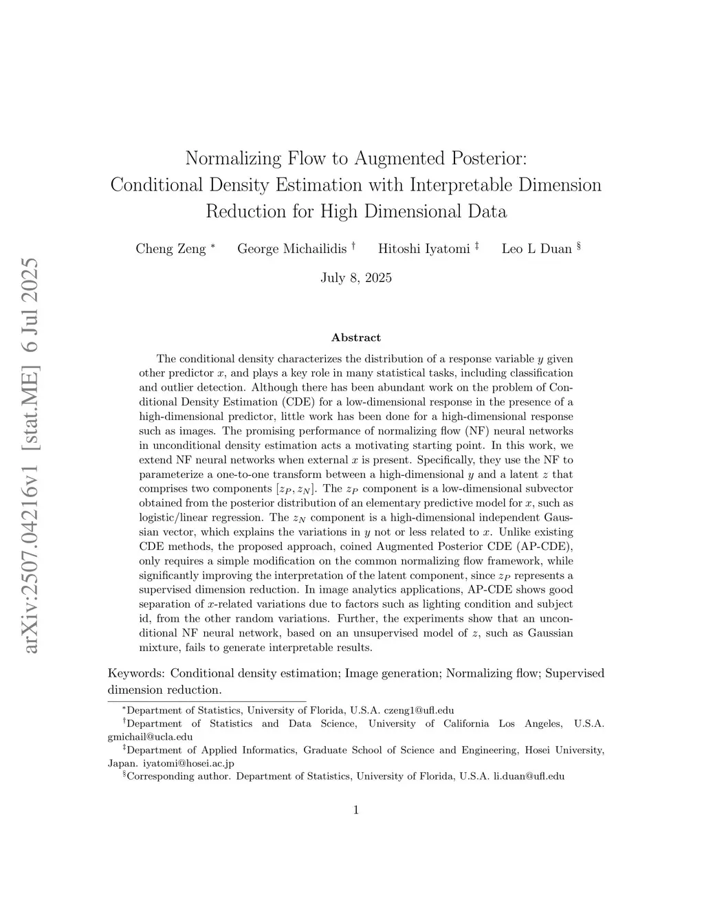 The conditional density characterizes the distribution of a response variable given other predictor , and plays a key role in many statistical tasks, including classification and outlier detection. Although there has been abundant work on the problem of Conditional Density Estimation (CDE) for a low-dimensional response in the presence of a high-dimensional predictor, little work has been done for a high-dimensional response such as images. The promising performance of normalizing flow (NF) neural networks in unconditional density estimation acts a motivating starting point. In this work, we extend NF neural networks when external is present. Specifically, they use the NF to parameterize a one-to-one transform between a high-dimensional and a latent that comprises two components \([z_P,z_N]\). The component is a low-dimensional subvector obtained from the posterior distribution of an elementary predictive model for , such as logistic/linear regression. The component is a high-dimensional independent Gaussian vector, which explains the variations in not or less related to . Unlike existing CDE methods, the proposed approach, coined Augmented Posterior CDE (AP-CDE), only requires a simple modification on the common normalizing flow framework, while significantly improving the interpretation of the latent component, since represents a supervised dimension reduction. In image analytics applications, AP-CDE shows good separation of -related variations due to factors such as lighting condition and subject id, from the other random variations. Further, the experiments show that an unconditional NF neural network, based on an unsupervised model of , such as Gaussian mixture, fails to generate interpretable results.