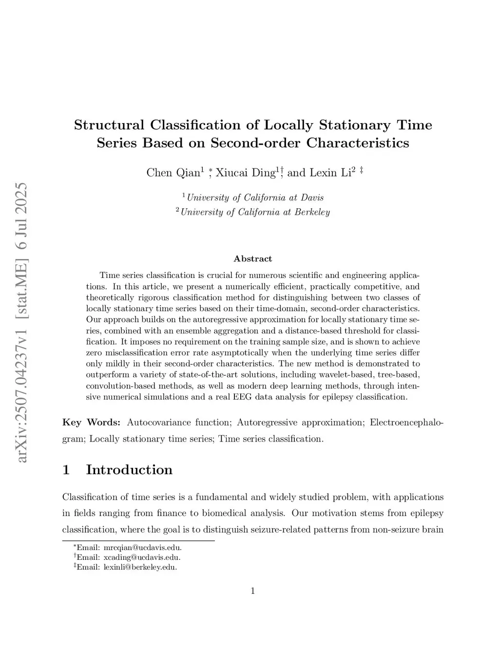 Time series classification is crucial for numerous scientific and engineering applications. In this article, we present a numerically efficient, practically competitive, and theoretically rigorous classification method for distinguishing between two classes of locally stationary time series based on their time-domain, second-order characteristics. Our approach builds on the autoregressive approximation for locally stationary time series, combined with an ensemble aggregation and a distance-based threshold for classification. It imposes no requirement on the training sample size, and is shown to achieve zero misclassification error rate asymptotically when the underlying time series differ only mildly in their second-order characteristics. The new method is demonstrated to outperform a variety of state-of-the-art solutions, including wavelet-based, tree-based, convolution-based methods, as well as modern deep learning methods, through intensive numerical simulations and a real EEG data analysis for epilepsy classification.