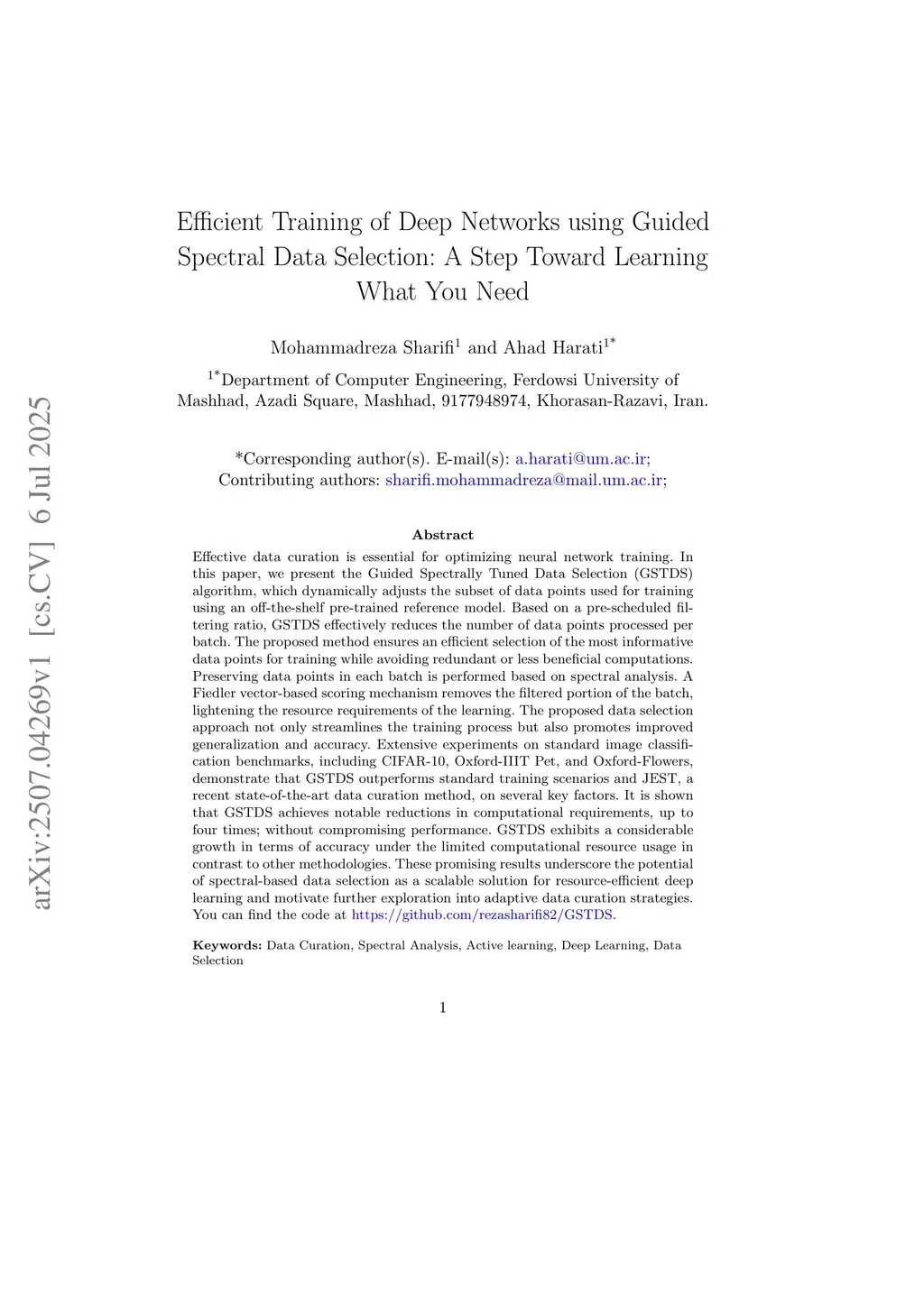 Effective data curation is essential for optimizing neural network training. In this paper, we present the Guided Spectrally Tuned Data Selection (GSTDS) algorithm, which dynamically adjusts the subset of data points used for training using an off-the-shelf pre-trained reference model. Based on a pre-scheduled filtering ratio, GSTDS effectively reduces the number of data points processed per batch. The proposed method ensures an efficient selection of the most informative data points for training while avoiding redundant or less beneficial computations. Preserving data points in each batch is performed based on spectral analysis. A Fiedler vector-based scoring mechanism removes the filtered portion of the batch, lightening the resource requirements of the learning. The proposed data selection approach not only streamlines the training process but also promotes improved generalization and accuracy. Extensive experiments on standard image classification benchmarks, including CIFAR-10, Oxford-IIIT Pet, and Oxford-Flowers, demonstrate that GSTDS outperforms standard training scenarios and JEST, a recent state-of-the-art data curation method, on several key factors. It is shown that GSTDS achieves notable reductions in computational requirements, up to four times, without compromising performance. GSTDS exhibits a considerable growth in terms of accuracy under the limited computational resource usage, in contrast to other methodologies. These promising results underscore the potential of spectral-based data selection as a scalable solution for resource-efficient deep learning and motivate further exploration into adaptive data curation strategies. You can find the code atthis https URL.