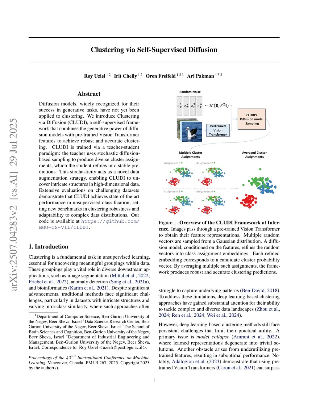 Diffusion models, widely recognized for their success in generative tasks, have not yet been applied to clustering. We introduce Clustering via Diffusion (CLUDI), a self-supervised framework that combines the generative power of diffusion models with pre-trained Vision Transformer features to achieve robust and accurate clustering. CLUDI is trained via a teacher-student paradigm: the teacher uses stochastic diffusion-based sampling to produce diverse cluster assignments, which the student refines into stable predictions. This stochasticity acts as a novel data augmentation strategy, enabling CLUDI to uncover intricate structures in high-dimensional data. Extensive evaluations on challenging datasets demonstrate that CLUDI achieves state-of-the-art performance in unsupervised classification, setting new benchmarks in clustering robustness and adaptability to complex data distributions. Our code is available atthis https URL.