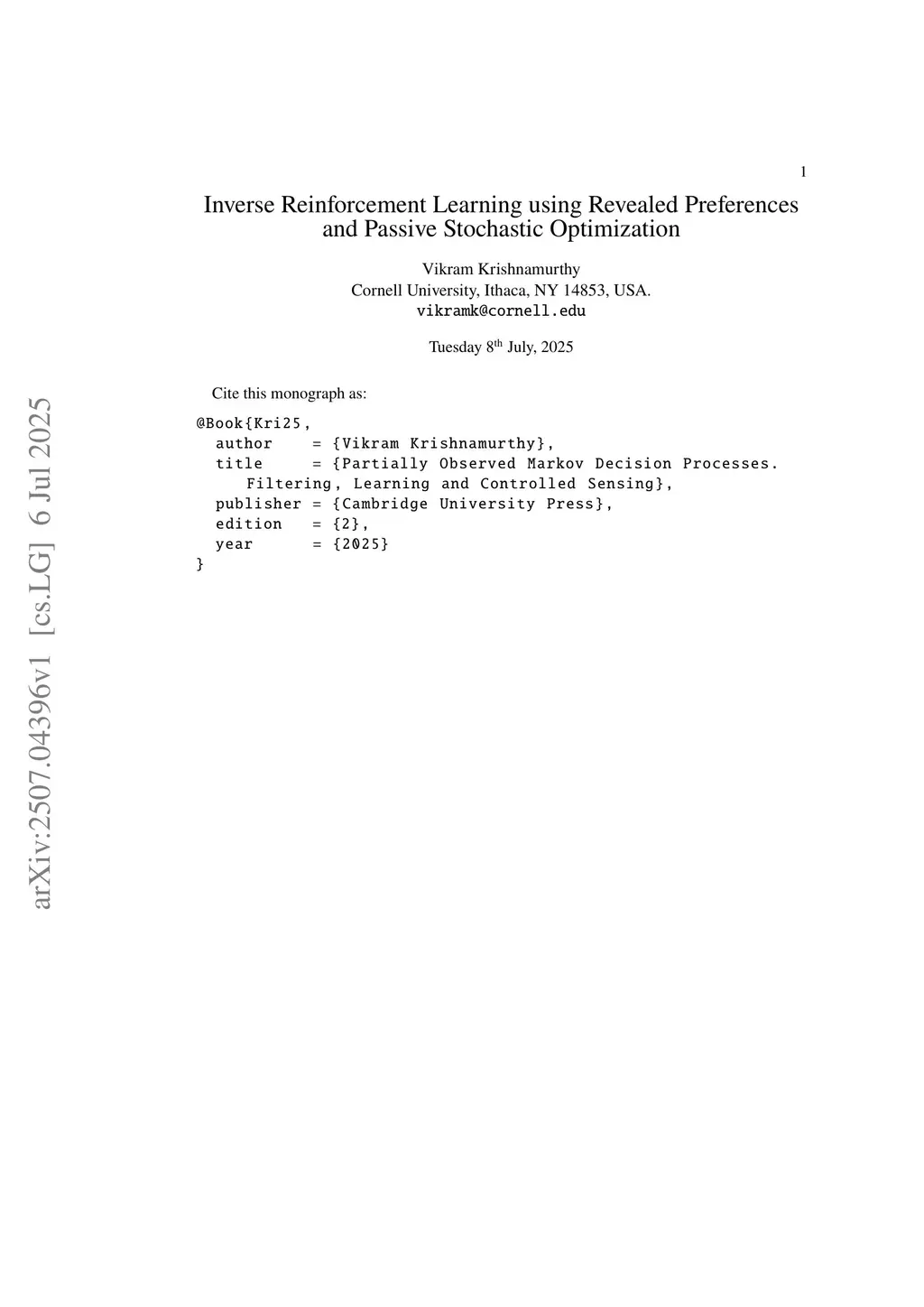 This monograph, spanning three chapters, explores Inverse Reinforcement Learning (IRL). The first two chapters view inverse reinforcement learning (IRL) through the lens of revealed preferences from microeconomics while the third chapter studies adaptive IRL via Langevin dynamics stochastic gradient algorithms.Chapter uses classical revealed preference theory (Afriat's theorem and extensions) to identify constrained utility maximizers based on observed agent actions. This allows for the reconstruction of set-valued estimates of an agent's utility. We illustrate this procedure by identifying the presence of a cognitive radar and reconstructing its utility function. The chapter also addresses the construction of a statistical detector for utility maximization behavior when agent actions are corrupted by noise.Chapter 2 studies Bayesian IRL. It investigates how an analyst can determine if an observed agent is a rationally inattentive Bayesian utility maximizer (i.e., simultaneously optimizing its utility and observation likelihood). The chapter discusses inverse stopping-time problems, focusing on reconstructing the continuation and stopping costs of a Bayesian agent operating over a random horizon. We then apply this IRL methodology to identify the presence of a Bayes-optimal sequential detector. Additionally, Chapter 2 provides a concise overview of discrete choice models, inverse Bayesian filtering, and inverse stochastic gradient algorithms for adaptive IRL.Finally, Chapter 3 introduces an adaptive IRL approach utilizing passive Langevin dynamics. This method aims to track time-varying utility functions given noisy and misspecified gradients. In essence, the adaptive IRL algorithms presented in Chapter 3 can be conceptualized as inverse stochastic gradient algorithms, as they learn the utility function in real-time while a stochastic gradient algorithm is in operation.
