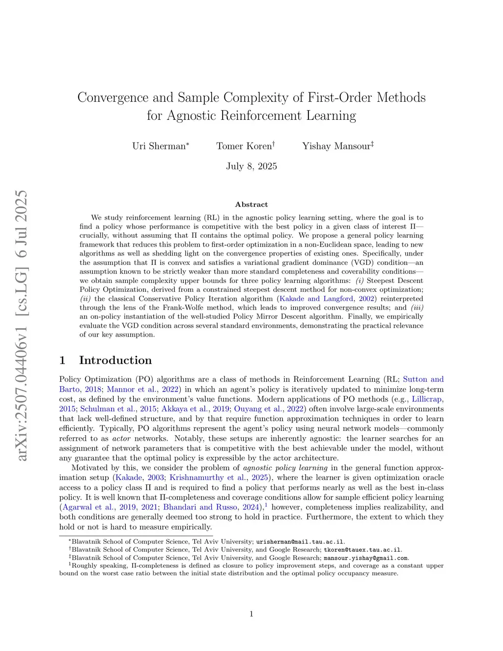 Convergence and Sample Complexity of First-Order Methods for Agnostic Reinforcement Learning