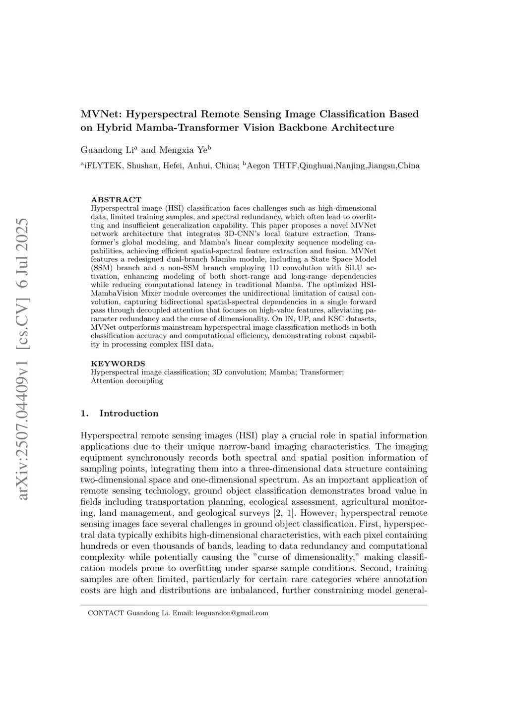 MVNet: Hyperspectral Remote Sensing Image Classification Based on Hybrid Mamba-Transformer Vision Backbone Architecture