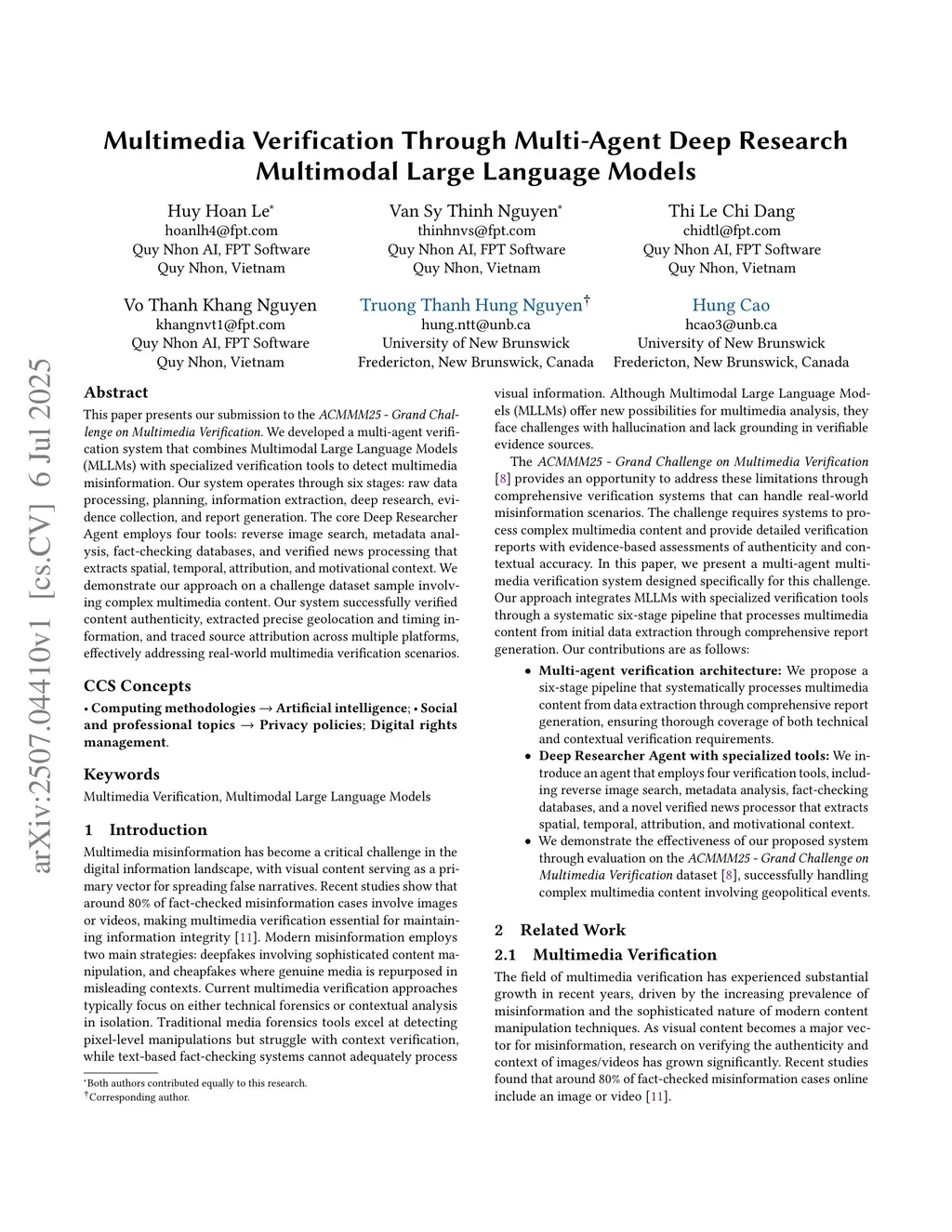 This paper presents our submission to the ACMMM25 - Grand Challenge on Multimedia Verification. We developed a multi-agent verification system that combines Multimodal Large Language Models (MLLMs) with specialized verification tools to detect multimedia misinformation. Our system operates through six stages: raw data processing, planning, information extraction, deep research, evidence collection, and report generation. The core Deep Researcher Agent employs four tools: reverse image search, metadata analysis, fact-checking databases, and verified news processing that extracts spatial, temporal, attribution, and motivational context. We demonstrate our approach on a challenge dataset sample involving complex multimedia content. Our system successfully verified content authenticity, extracted precise geolocation and timing information, and traced source attribution across multiple platforms, effectively addressing real-world multimedia verification scenarios.