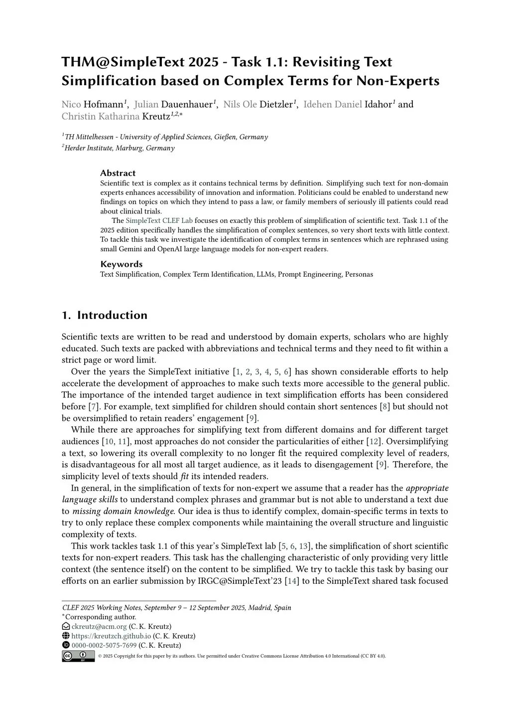 Scientific text is complex as it contains technical terms by definition. Simplifying such text for non-domain experts enhances accessibility of innovation and information. Politicians could be enabled to understand new findings on topics on which they intend to pass a law, or family members of seriously ill patients could read about clinical trials. The SimpleText CLEF Lab focuses on exactly this problem of simplification of scientific text. Task 1.1 of the 2025 edition specifically handles the simplification of complex sentences, so very short texts with little context. To tackle this task we investigate the identification of complex terms in sentences which are rephrased using small Gemini and OpenAI large language models for non-expert readers.