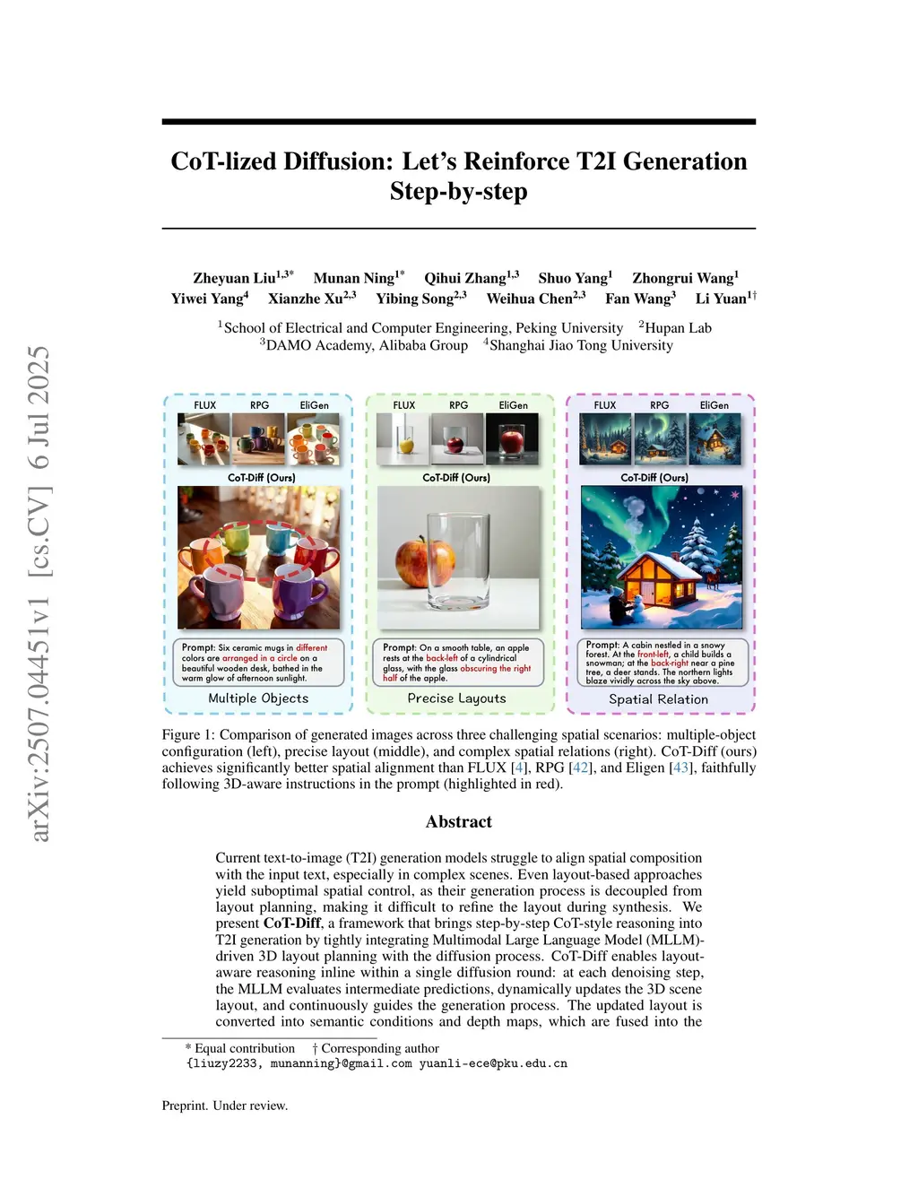 Current text-to-image (T2I) generation models struggle to align spatial composition with the input text, especially in complex scenes. Even layout-based approaches yield suboptimal spatial control, as their generation process is decoupled from layout planning, making it difficult to refine the layout during synthesis. We present CoT-Diff, a framework that brings step-by-step CoT-style reasoning into T2I generation by tightly integrating Multimodal Large Language Model (MLLM)-driven 3D layout planning with the diffusion process. CoT-Diff enables layout-aware reasoning inline within a single diffusion round: at each denoising step, the MLLM evaluates intermediate predictions, dynamically updates the 3D scene layout, and continuously guides the generation process. The updated layout is converted into semantic conditions and depth maps, which are fused into the diffusion model via a condition-aware attention mechanism, enabling precise spatial control and semantic injection. Experiments on 3D Scene benchmarks show that CoT-Diff significantly improves spatial alignment and compositional fidelity, and outperforms the state-of-the-art method by 34.7% in complex scene spatial accuracy, thereby validating the effectiveness of this entangled generation paradigm.