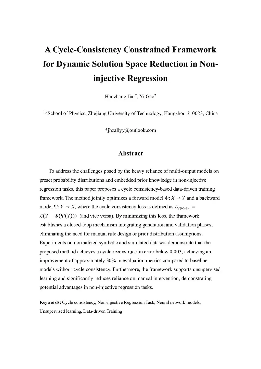 To address the challenges posed by the heavy reliance of multi-output models on preset probability distributions and embedded prior knowledge in non-injective regression tasks, this paper proposes a cycle consistency-based data-driven training framework. The method jointly optimizes a forward model {\Phi}: X to Y and a backward model {\Psi}: Y to X, where the cycle consistency loss is defined as L _cycleb equal L(Y reduce {\Phi}({\Psi}(Y))) (and vice versa). By minimizing this loss, the framework establishes a closed-loop mechanism integrating generation and validation phases, eliminating the need for manual rule design or prior distribution assumptions. Experiments on normalized synthetic and simulated datasets demonstrate that the proposed method achieves a cycle reconstruction error below 0.003, achieving an improvement of approximately 30% in evaluation metrics compared to baseline models without cycle consistency. Furthermore, the framework supports unsupervised learning and significantly reduces reliance on manual intervention, demonstrating potential advantages in non-injective regression tasks.
