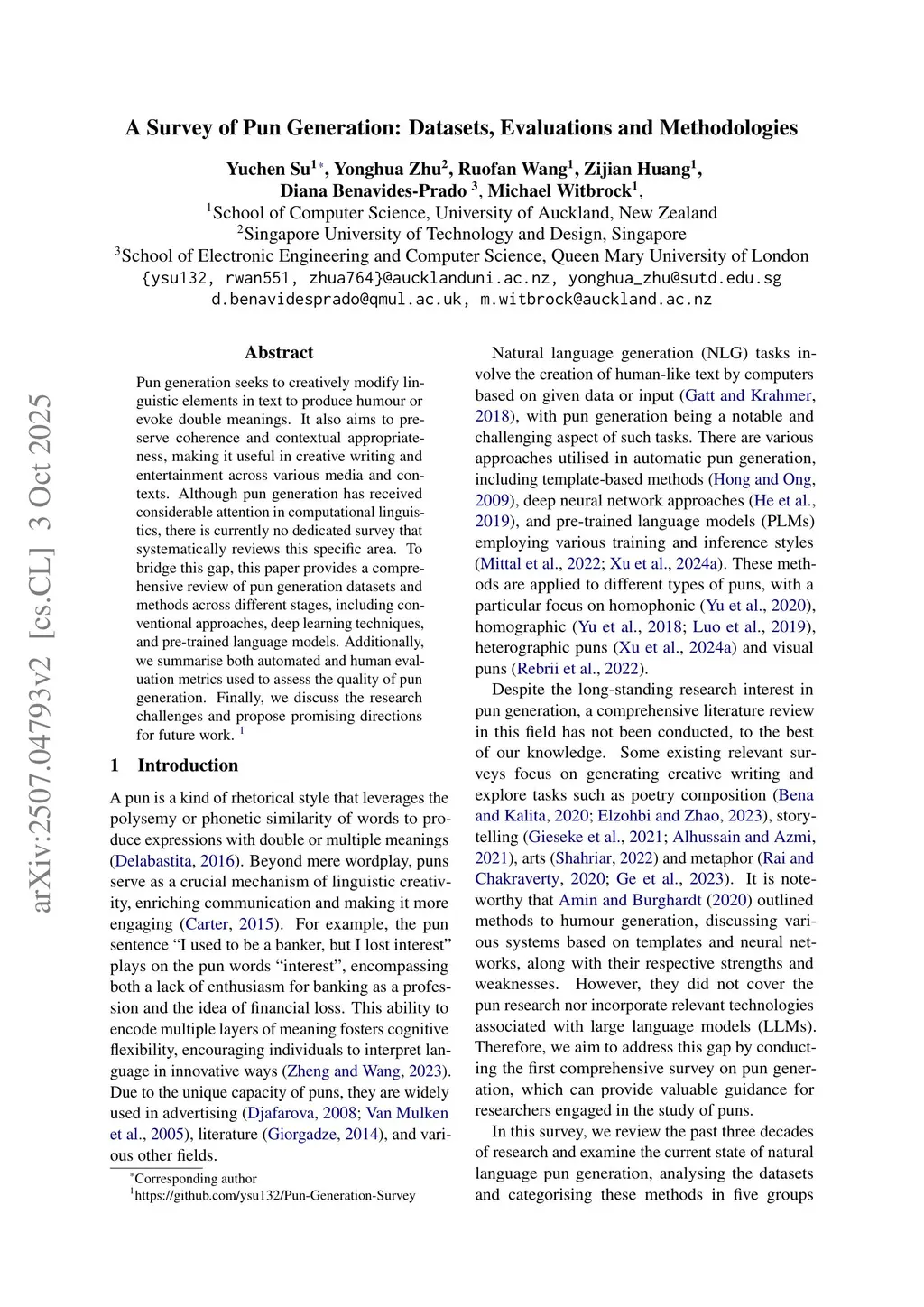 A Survey of Pun Generation: Datasets, Evaluations and Methodologies